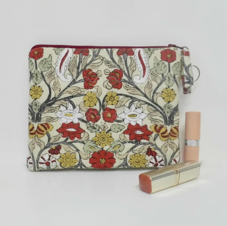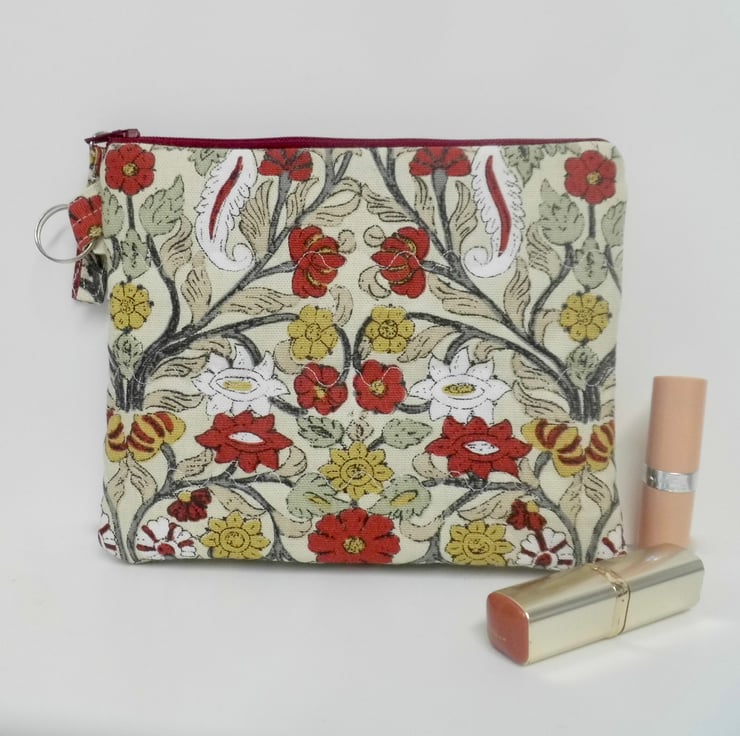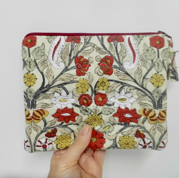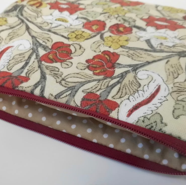 This zipped purse is made with a medium weight cotton fabric with a pint of red flowers and winding stems on a dark cream background. I backed this fabric with fusible quilter's wadding and then machine stitched across each side with three rows of wave stitch to achieve a lightly quilted effect. It is lined with a spotted coffee colour quilting cotton.