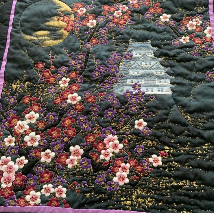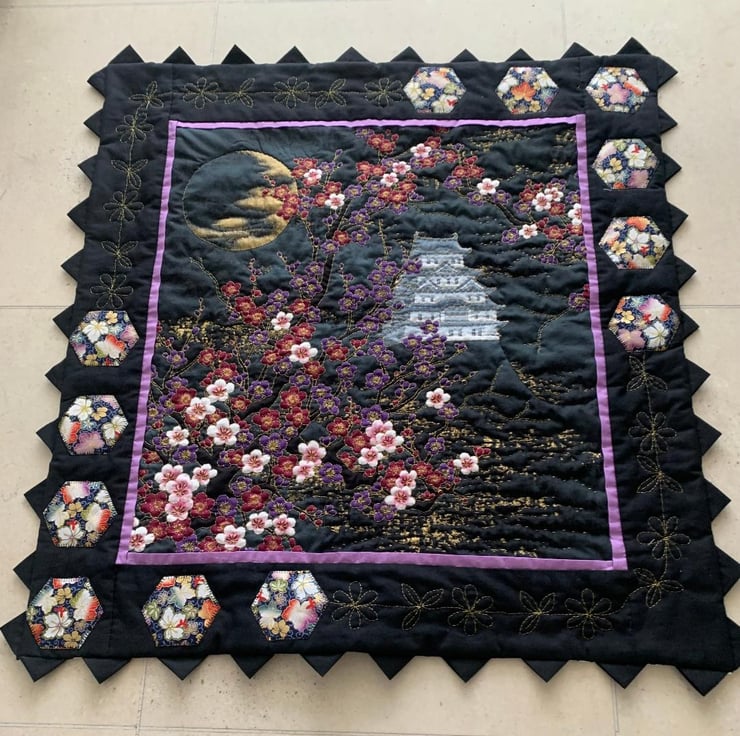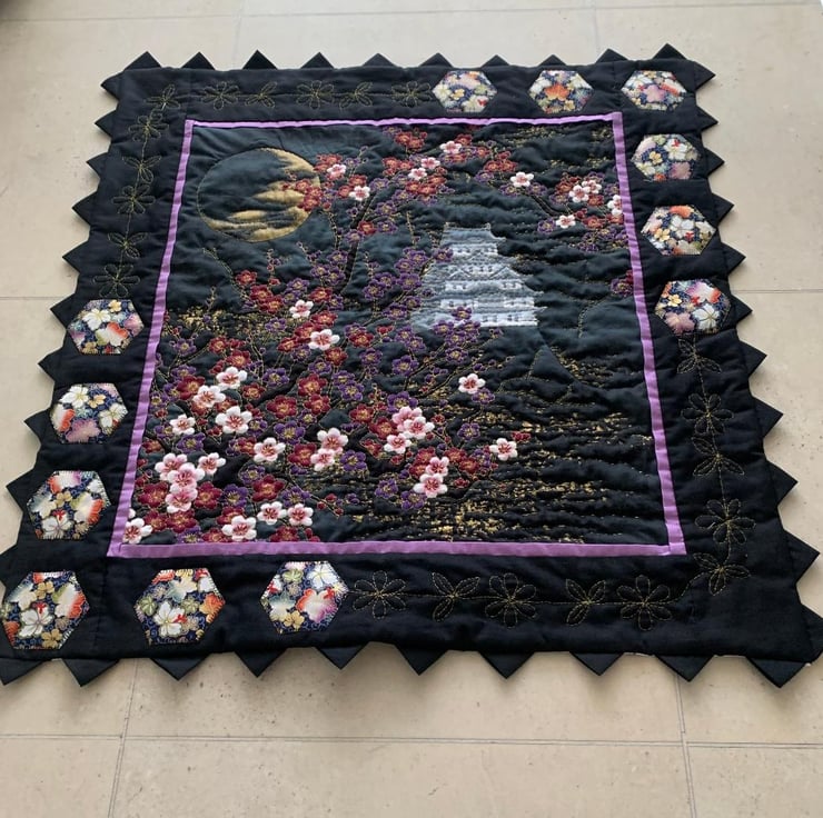This is a hand quilted piece of wall art that I have hand quilted mostly with gold metalic thread. it depicts a large moon shining over lots of cherry blossom with a oriental building in the background. I have added a border with japanese flowered hexigons appliqued onto it and hand embroidered/quilted a vine with flowers all in gold metalic thread..