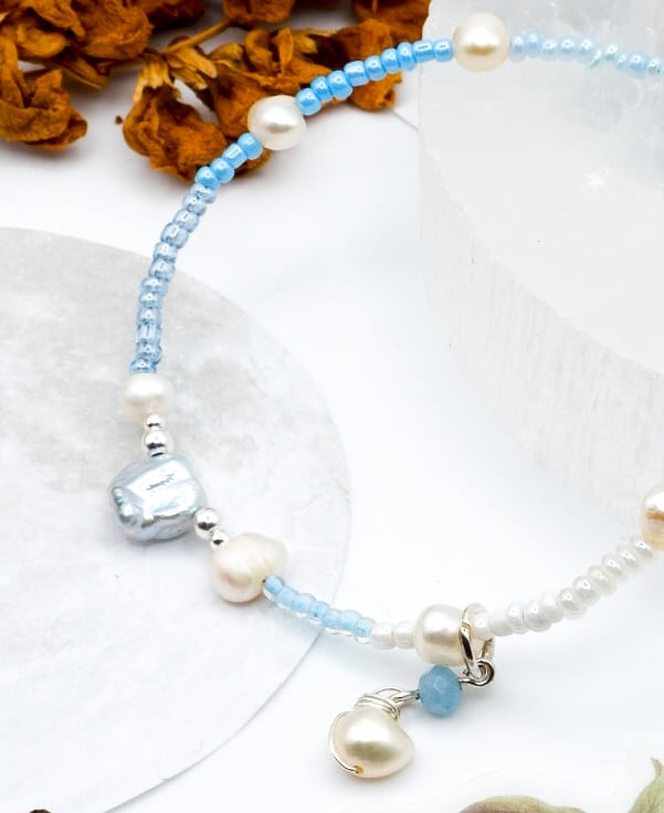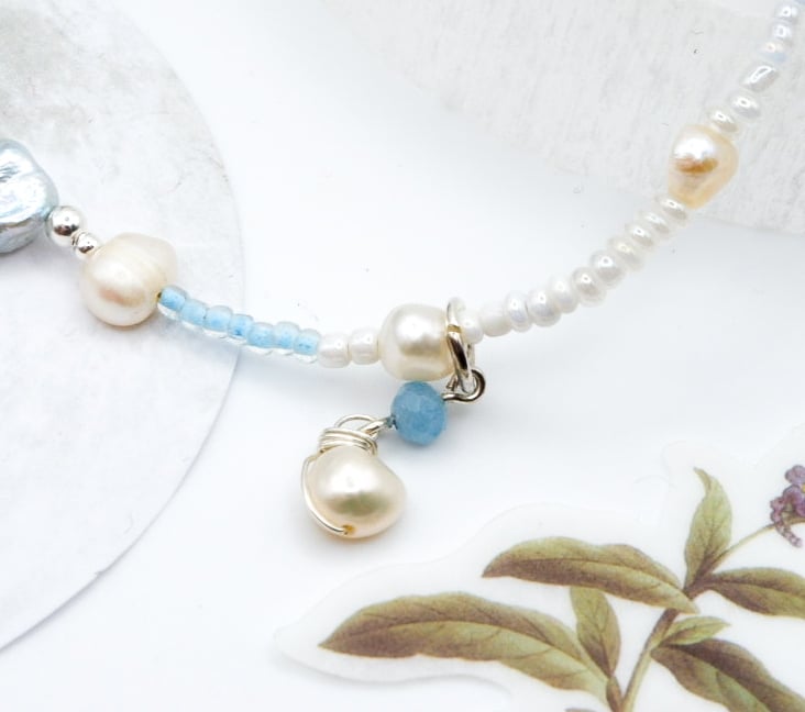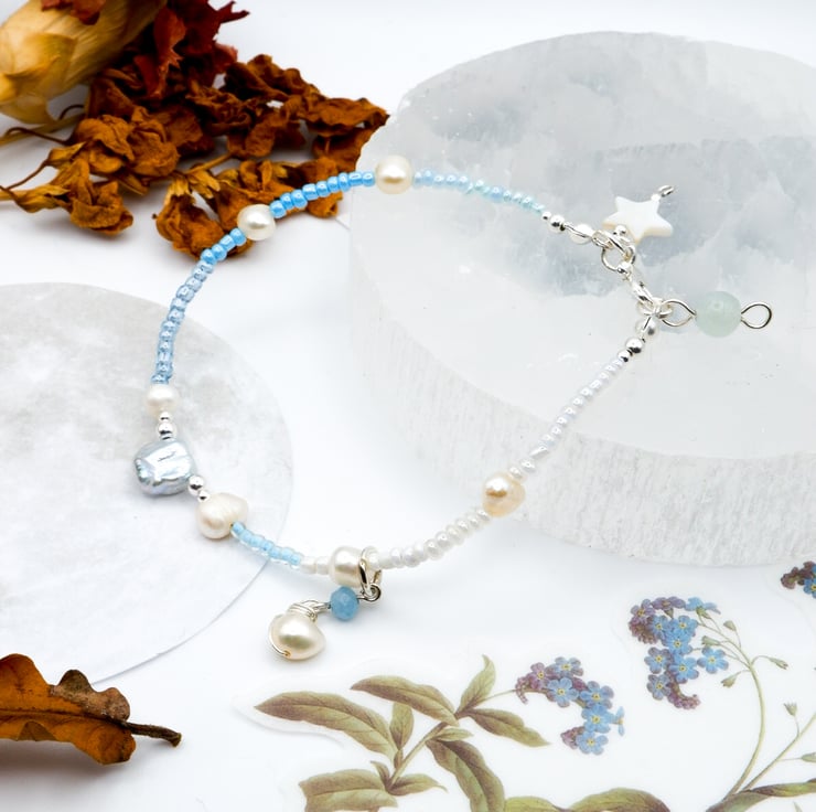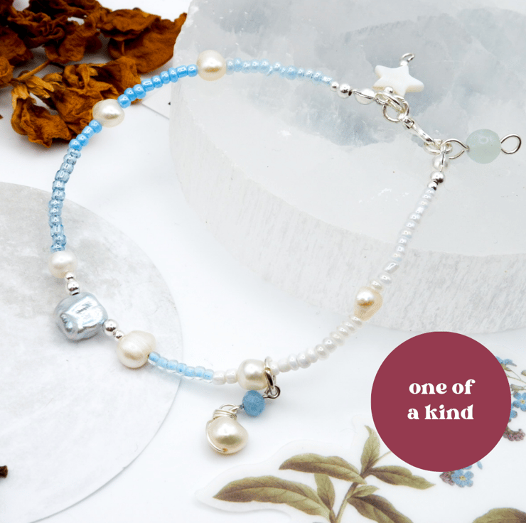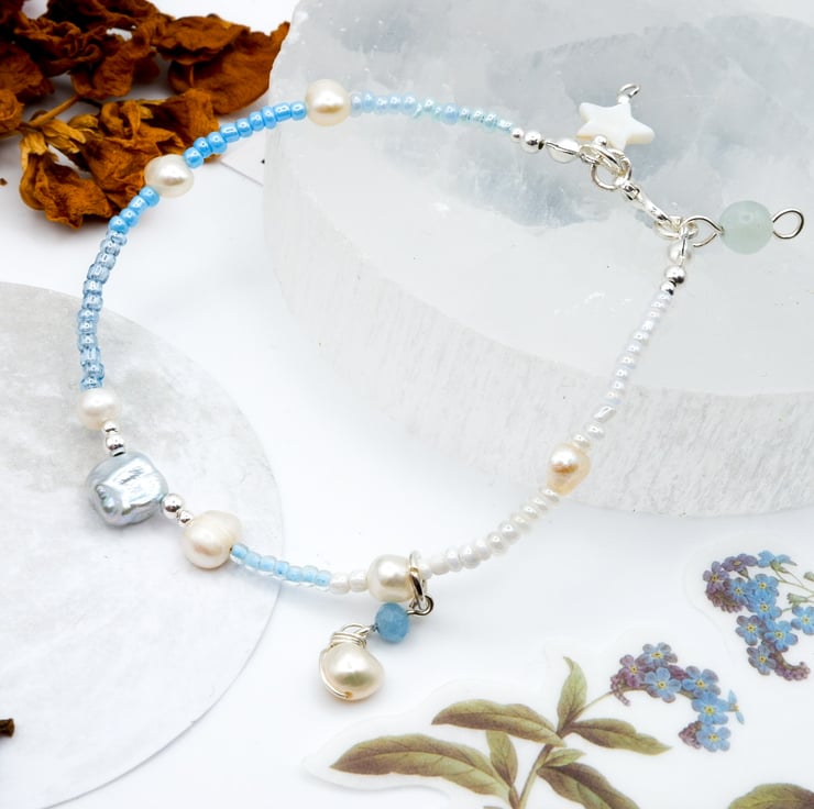 We've used high quality Czech glass accent beads in pale blue graduated rondelles, genuine freshwater ivory baroque pearls, a lovely celestial-inspired silver star charm, sterling silver accent beads, and a dainty hand-carved mother of pearl star charm pendant.