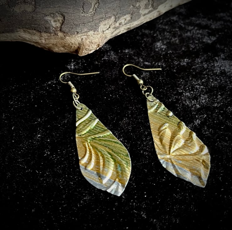 They are 4.8 cm long and 2 cm at the widest point and have been hung from bronze ear wires.