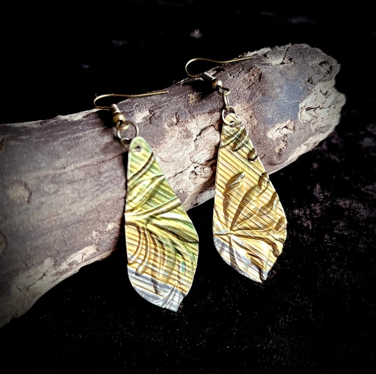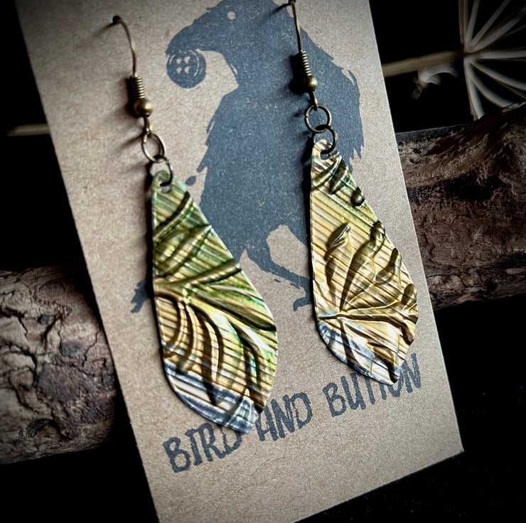 These earrings were cut from a used tin then embossed with a (raised) floral design.