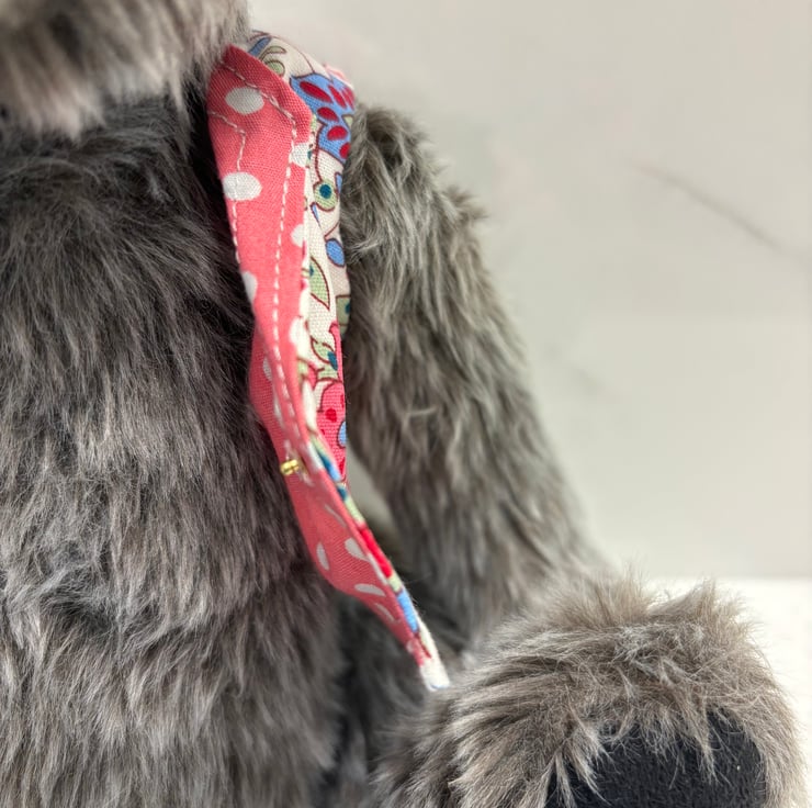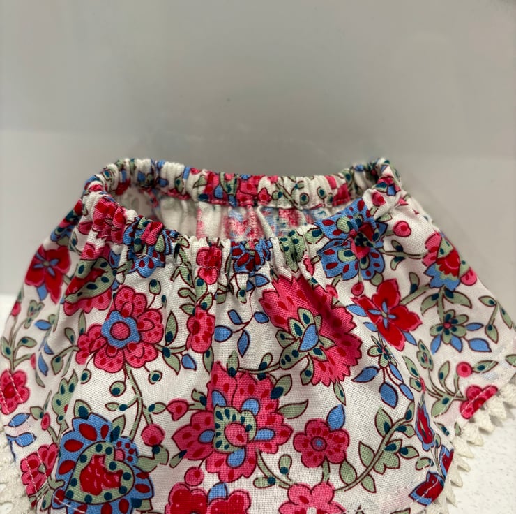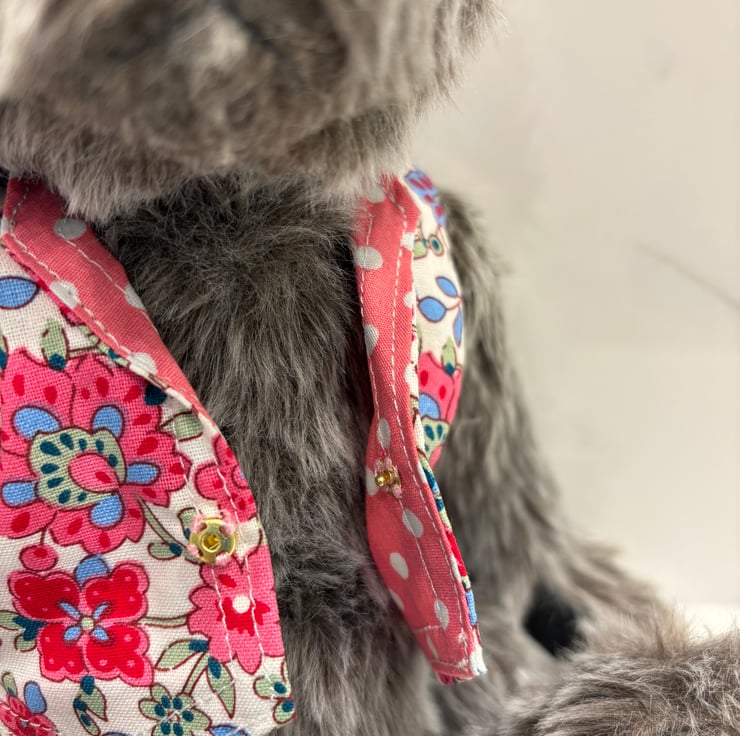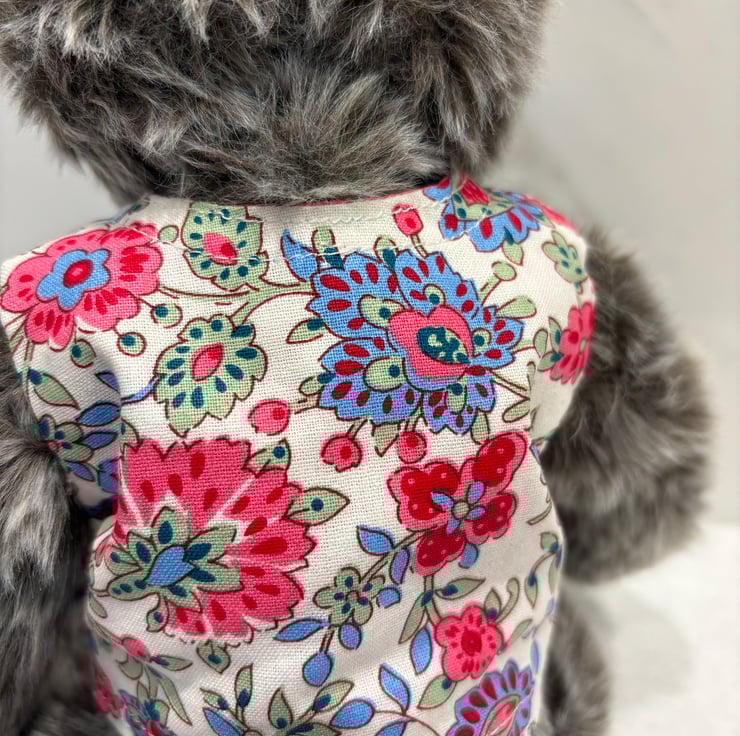 This small size teddy outfit is made to fit a bear appropriately 12”/31cm tall. Waistcoat and skirt. The waistcoat is lined in a pink polka dot fabric which coordinates beautifully with this vintage style floral print. The skirt has an elastic waist and is trimmed with lace.