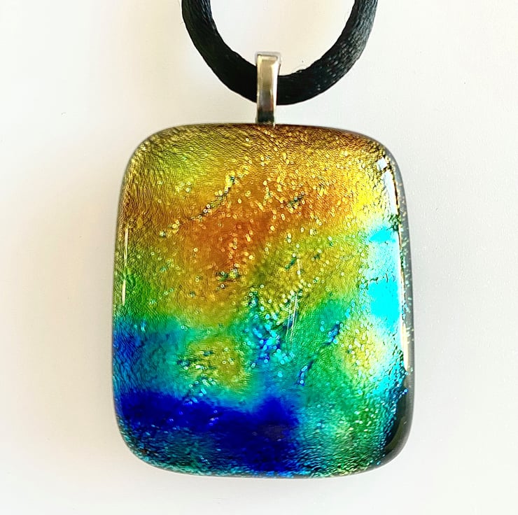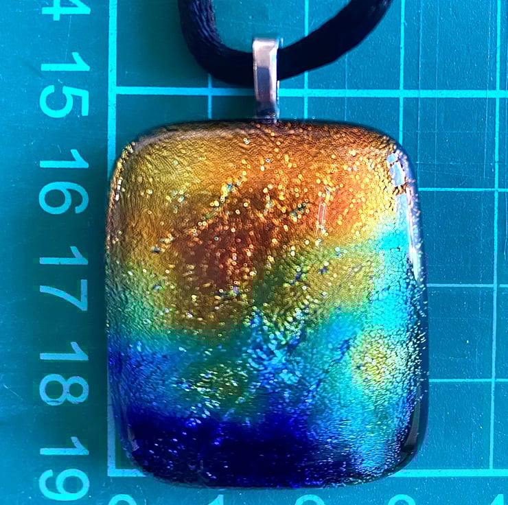 A beautiful vibrant dichroic pattern glass pendant using hand cut glass fused at 800 degrees Celsius. The glass shimmers in the light showing off an array of rainbow colours to brighten up any day,