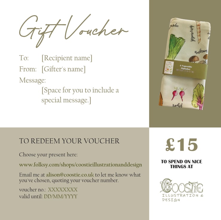 Simply provide your name, the name of your recipient and a personal message and I will add this information to one of my voucher templates. All instructions for redeeming the gift voucher, including my e-mail address, will be included in the PDF file I will email to you. You can print this off to create a physical gift voucher, or forward on as a digital voucher, as you wish.