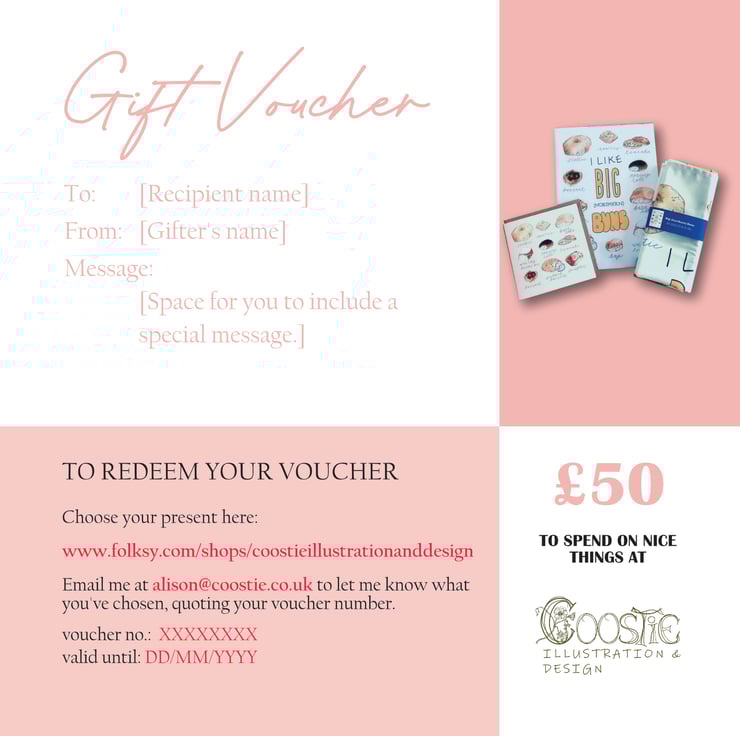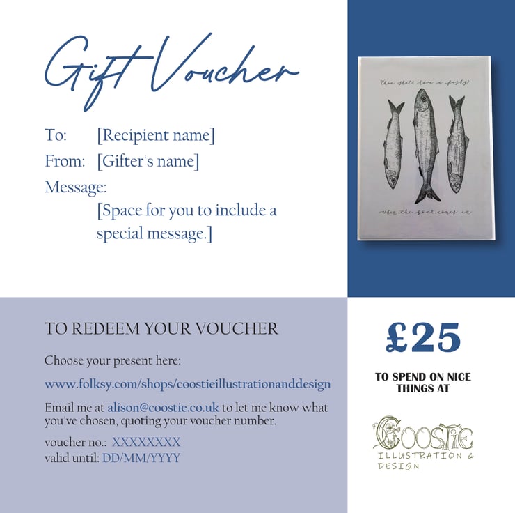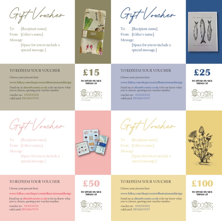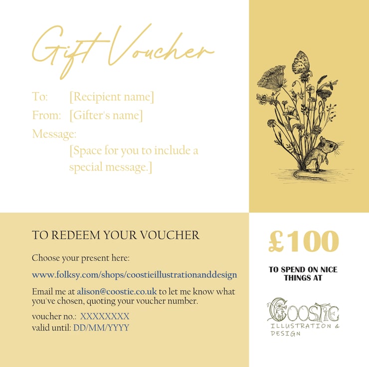 A gift voucher is a perfect way to reduce unwanted presents, as it allows your loved one to pick their own selection from amongst my range of eco art prints and gifts. They can even contact me for a bespoke commission for gift vouchers to the value of £50 and above. The gift card will be date stamped for 12 months, meaning your recipient has plenty of time to choose what they'd like. Once they've made their decision, they can simply send me an email to redeem their gift with no UK postage costs.