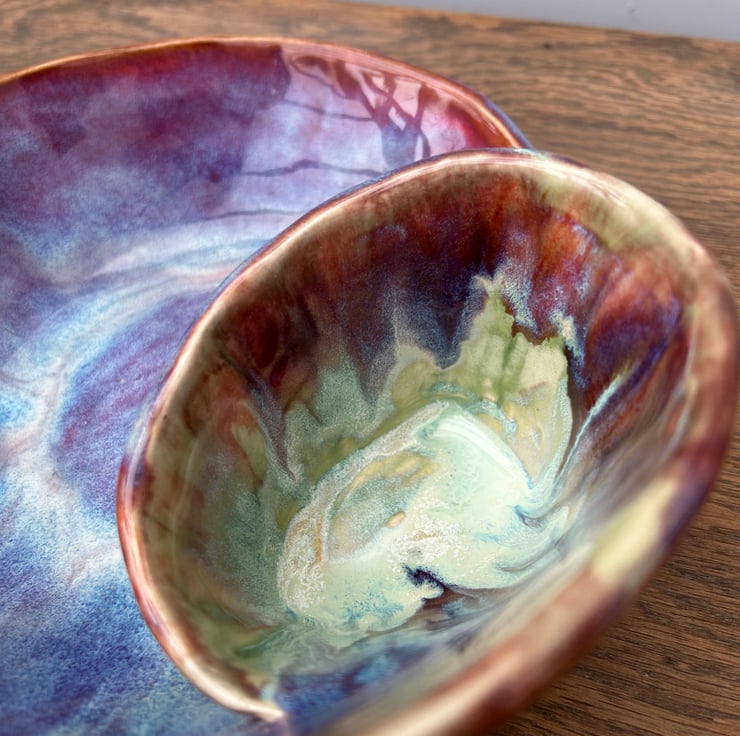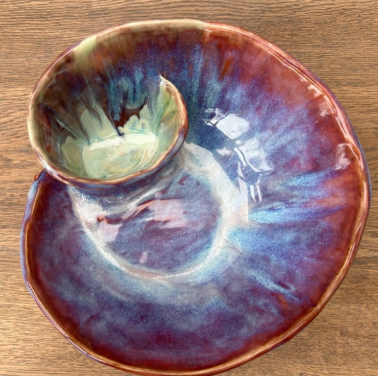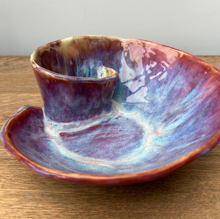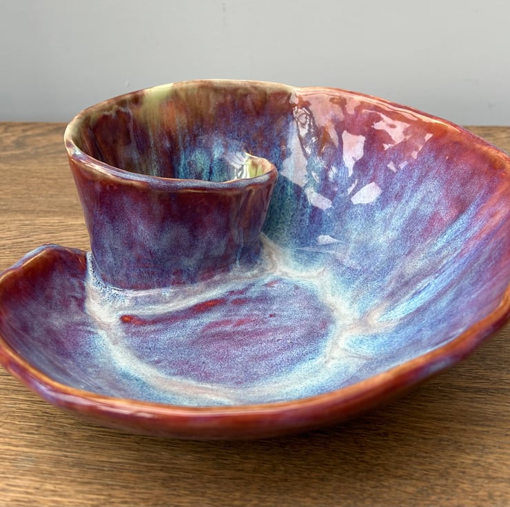 Handmade ceramic chip and dip bowl - put crisps, chips, crudités in main section and fill the small bowl with a lovely dip. Perfect for entertaining and would make a lovely present
