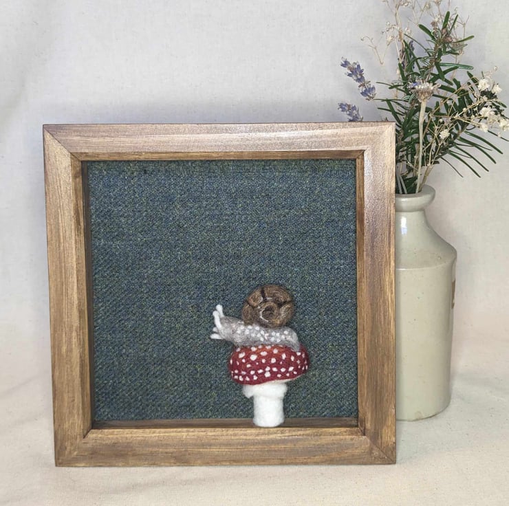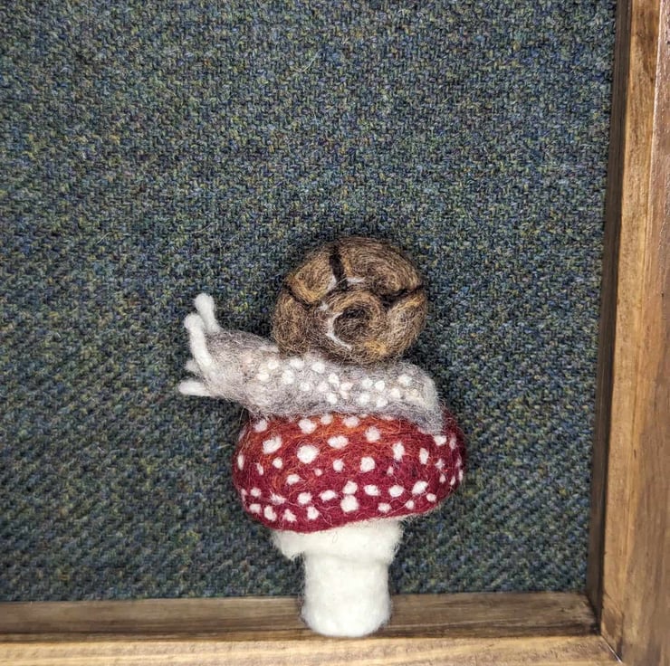 Needle felted garden snail on a fly agaric toadstool with a upholstery tweed style fabric background in a wood stained box frame. The snail and toadstool were made using the needle felting technique. This binds the fibres together using a barbed needle.