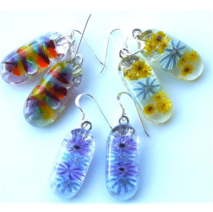 They comprise 2 layers of carefully handcut clear bullseye glass with a top layer of pretty millefiori flowery glass slices.