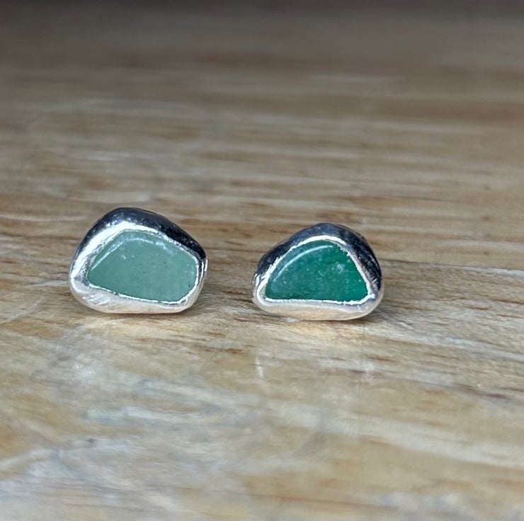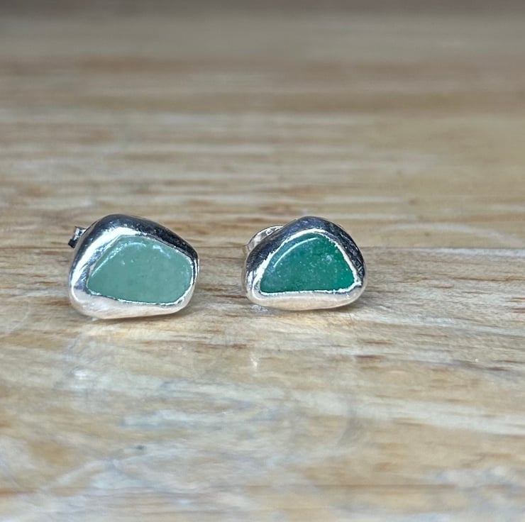 Stunning sterling silver stud earrings with pieces of green Aventurine gemstone crystals. This pair are sisters not twins!