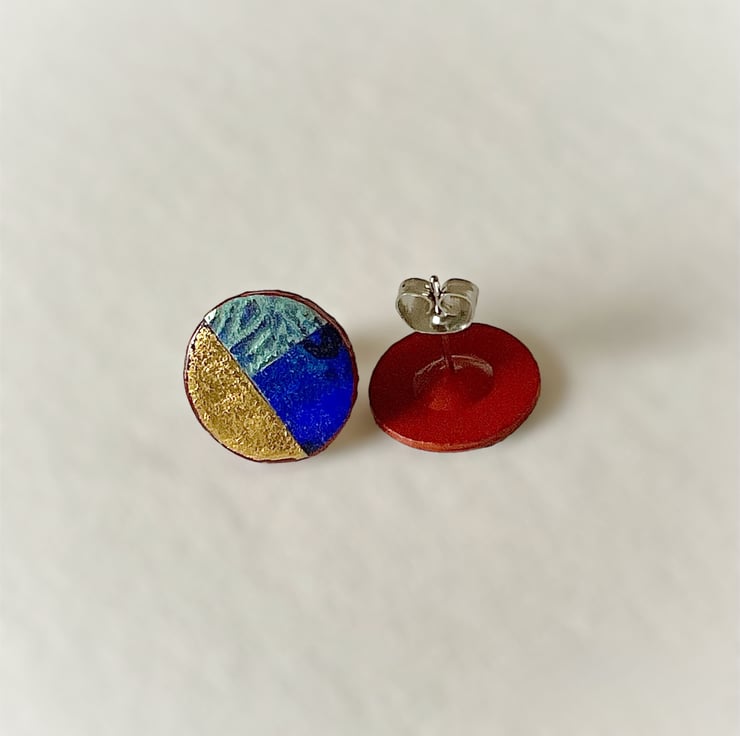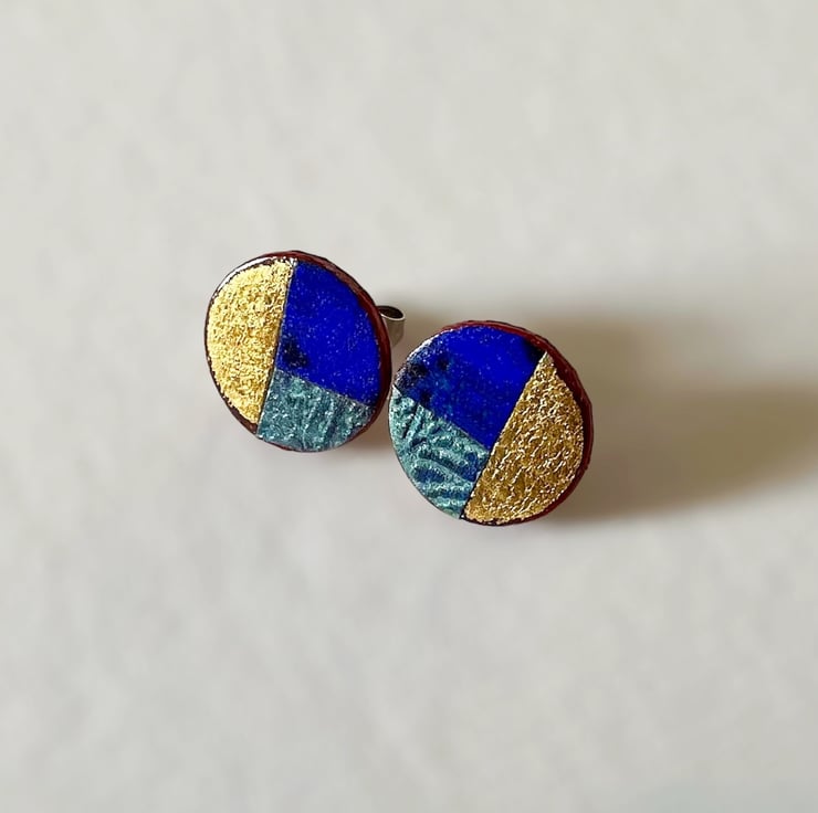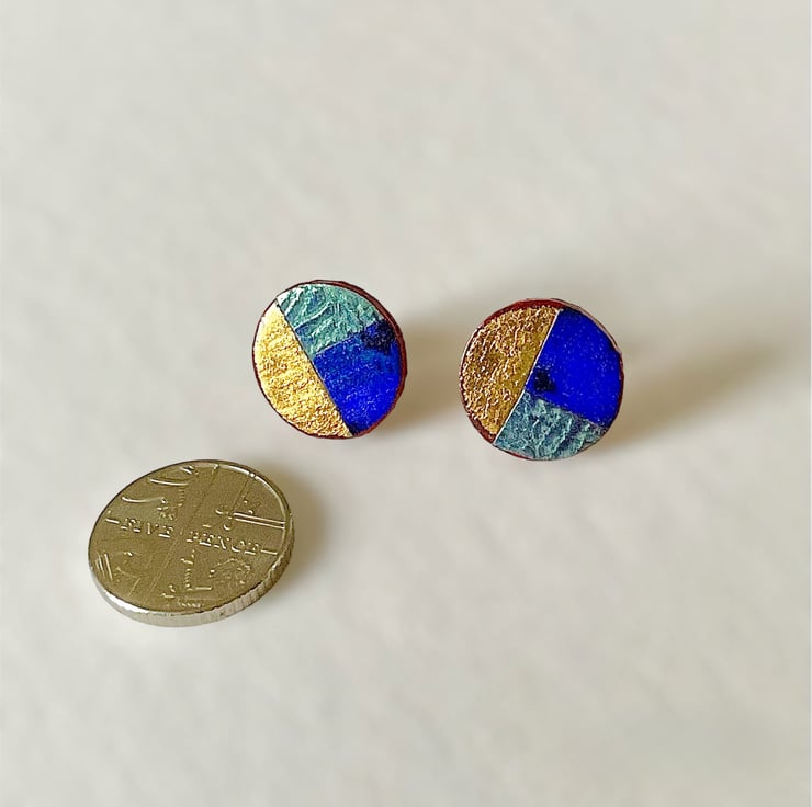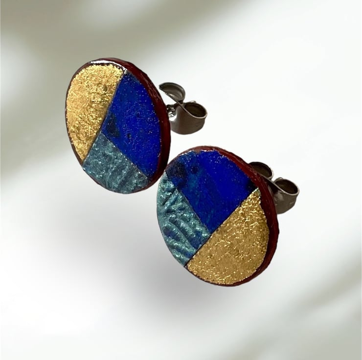 Rich blue and gold geometric ear studs with delicate embossed fern design detail in silver with metallic green wash. These small stud earrings have a luxurious look with a softly distressed surface created from layers of acrylic paint and metallic foils on paper. Made by laminating layers of cartridge paper these little studs are strong and durable. Completely unique and handmade and mounted on surgical steel posts. All my item of jewellery are painted on the back and given several layers of transparent lacquer to protect against water or grease ingress.