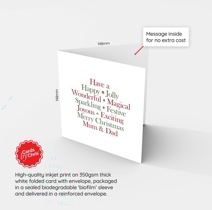 The cards are printed and folded on 148 x 148mm 350gsm thick white silk stock with envelope included, which are both sourced from well-managed and sustainable forests.