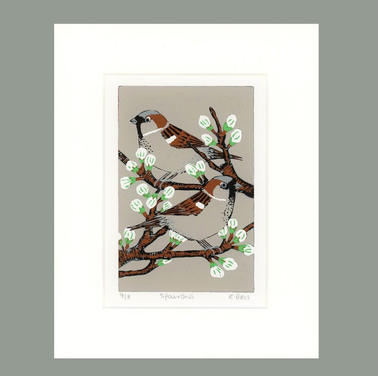 This is my six colour reduction lino print of Sparrows on Hawthorne blossom.