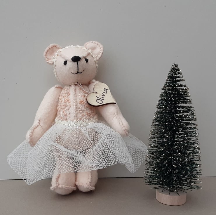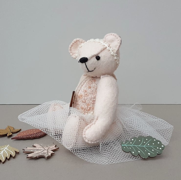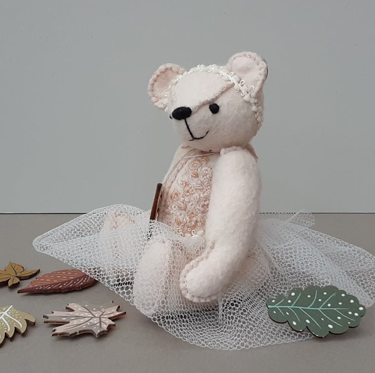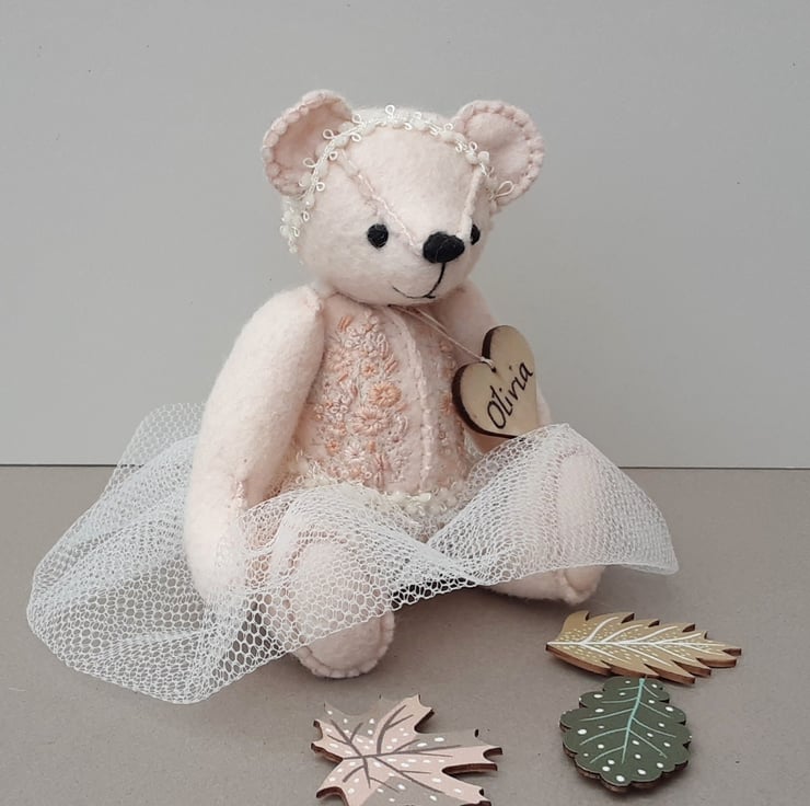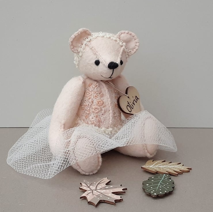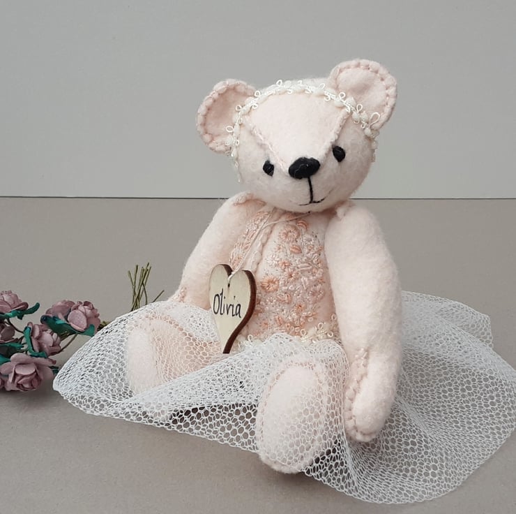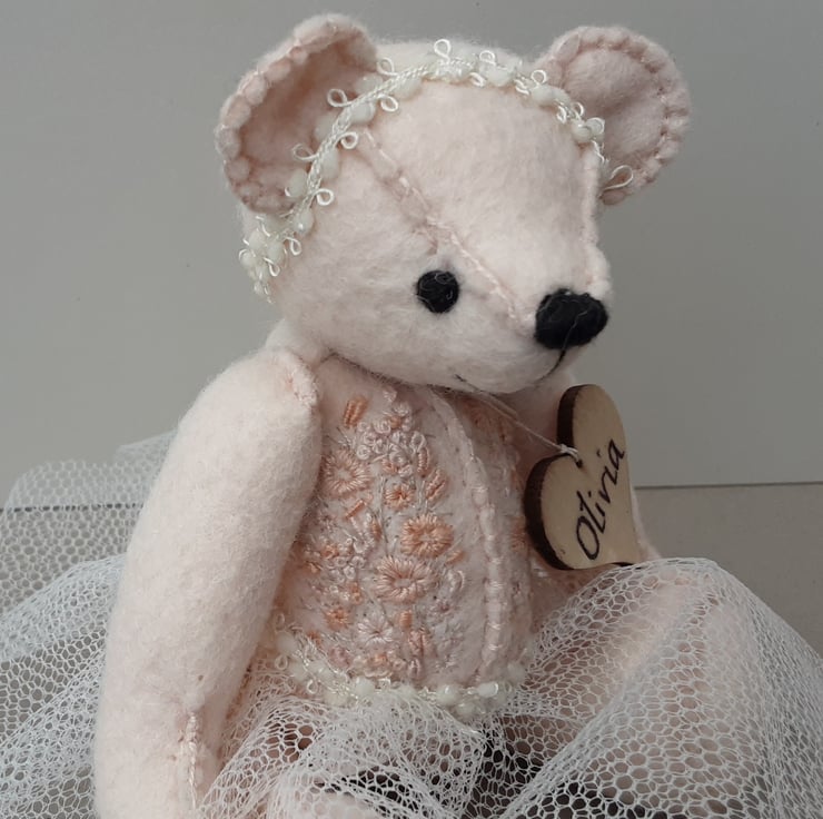 Meet Olivia, a pretty little bear standing at 6" tall, a hand sewn and embroidered artist bear designed for my new Signature range of adult collectable teddy bears. All of the bears from the new Signature range feature beautiful hand embroidered flowers to their body parts, each one is totally unique and the amount and placement of embroidery will differ from bear to bear. Made from quality wool felt they are all completely hand sewn, the seams are sewn three times to ensure stability and the seams are part of the feature and are worked on the right side of the fabric.