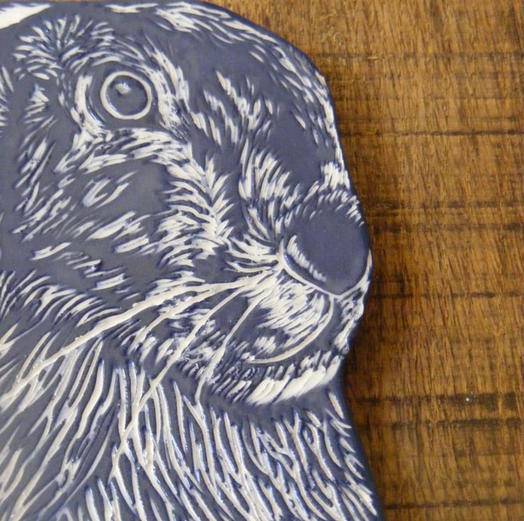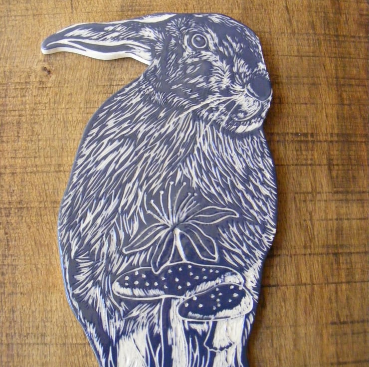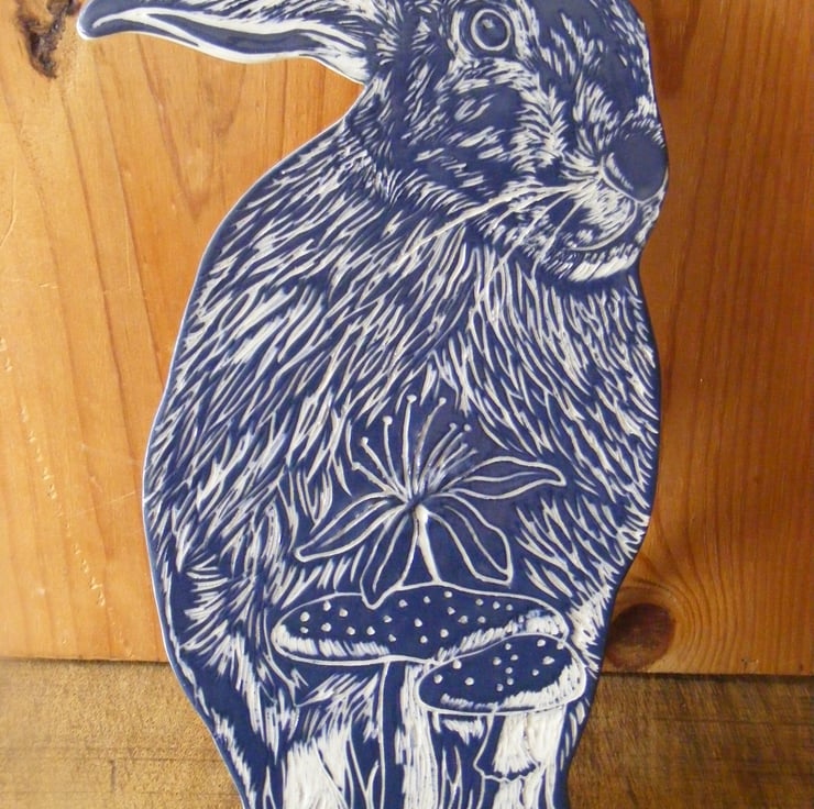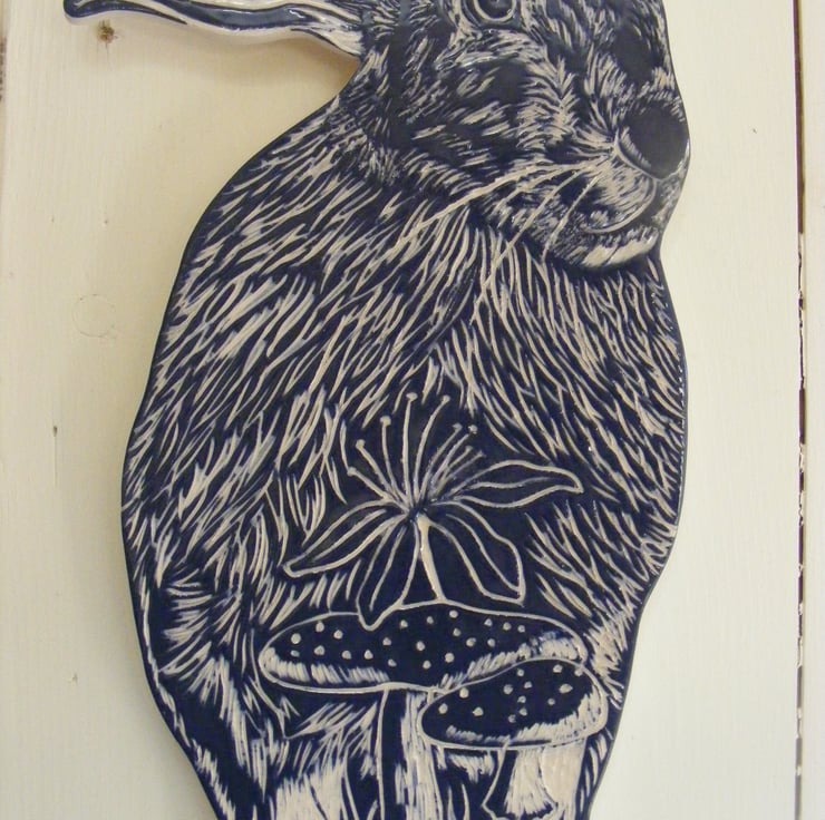 Esther hare is a wall decoration created from earthenware clay and a dark blue slip which is carved freehand adding to that unique quality. She stands approx 26.5cm high x 16cm wide and has a hook attached to the back for wall hanging. When hung on the wall a little blue tack is advisable behind at the base to help balance her out her ears are quite long!) Alternatively and personally I think she looks stunning like this, in a sturdy plate stand or up against a wall as long as she cannot be disturbed. Please do not hang outside this is not frost proof.