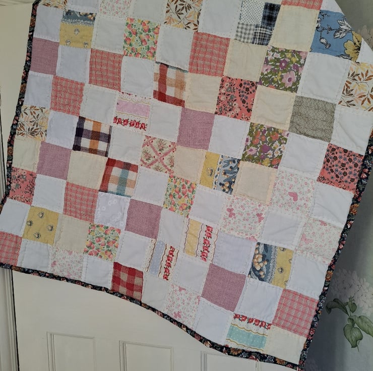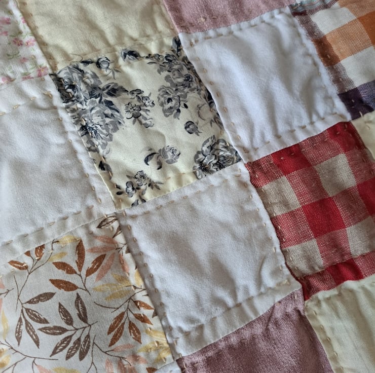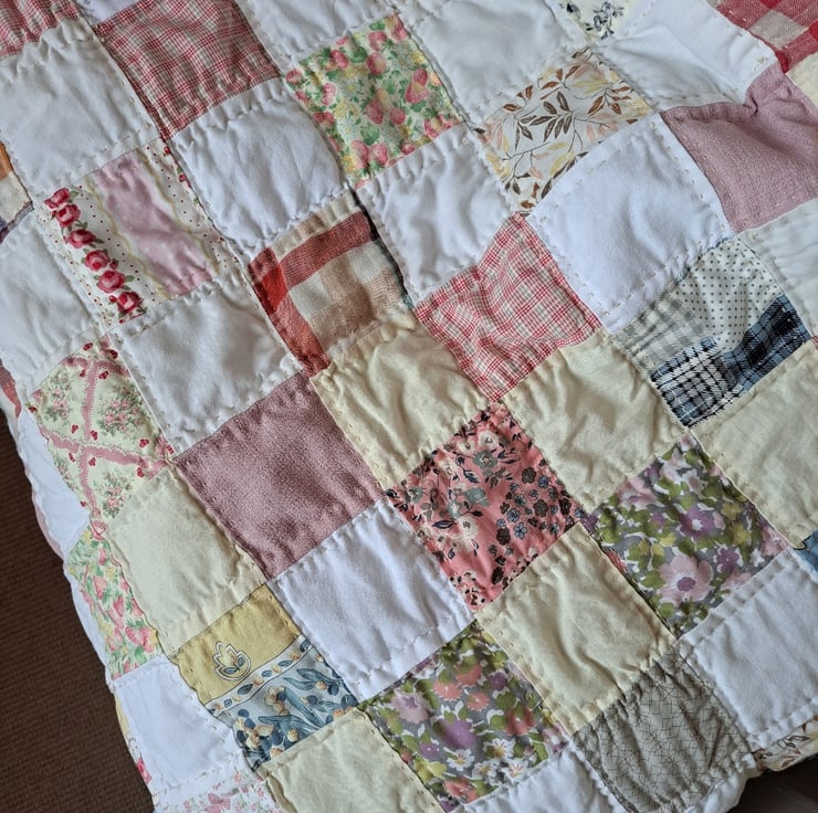 Simple squares in faded fabrics give this sweet little quilt a vintage feel. Measuring 99cm by 87cm, the quilt would suit a cot or small bed and could even be used as a changing mat. Hand-quilted. Contains vintage fabrics.