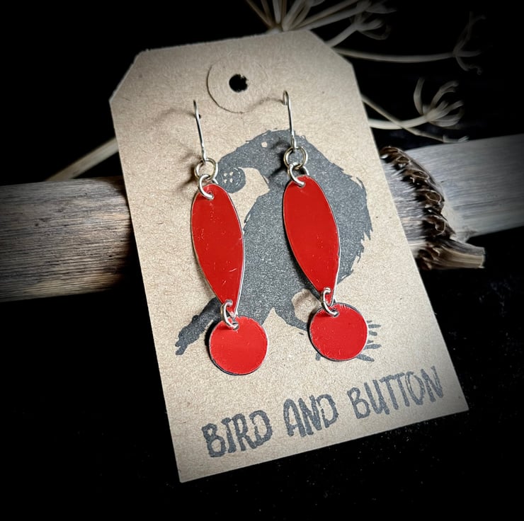 These bright red earrings were cut from a used shortbread biscuit tin and hung from surgical steel hooks.