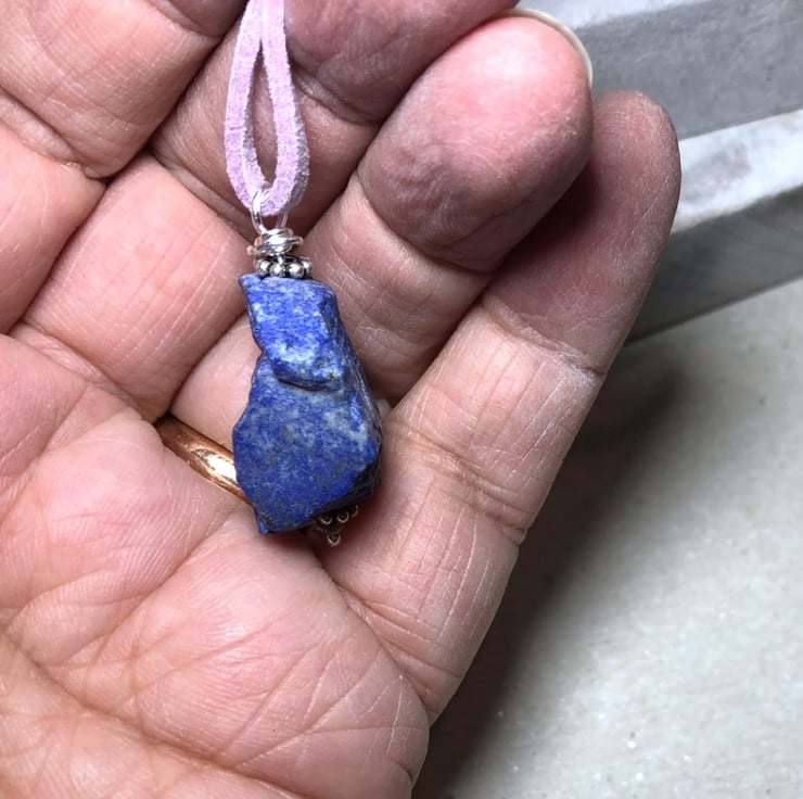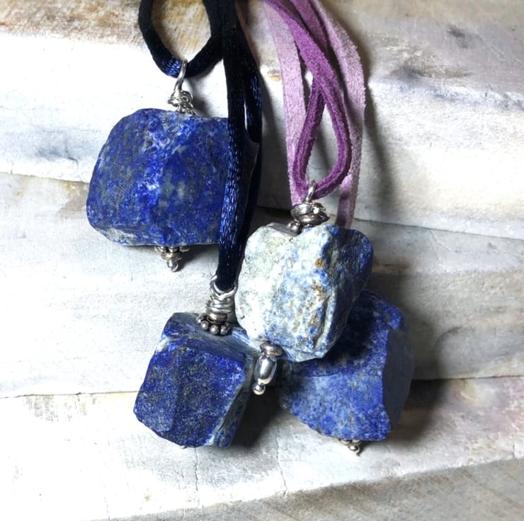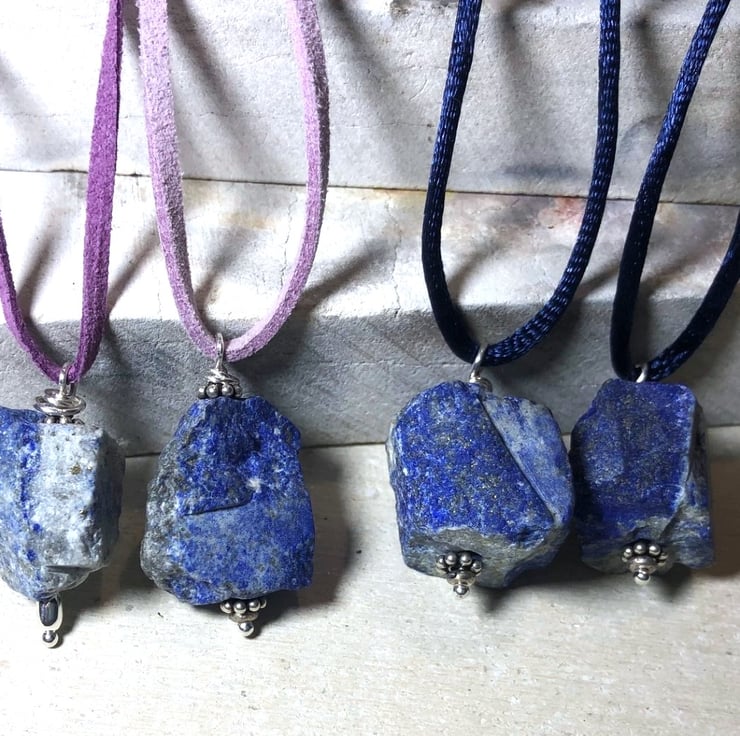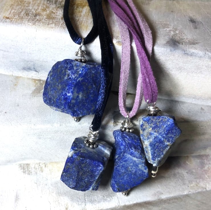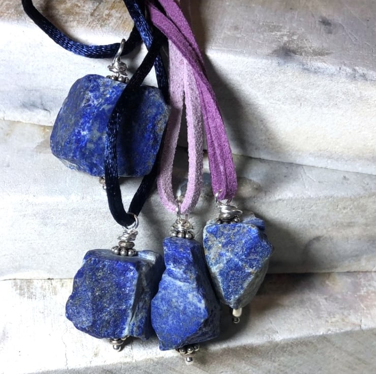 For something different how about these uncut and unpolished pieces of stunning lapis lazuli hung on a lavender faux suede cord or a deep blue silken cord to make an unusual pendant. There are varying shades of beautiful blues in these stones along with some whites and other colours, sometimes even a little speck of gold colour..