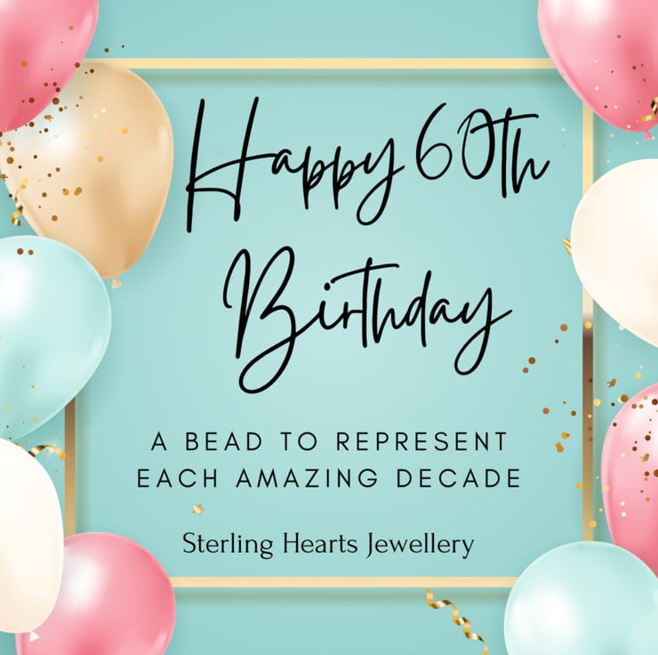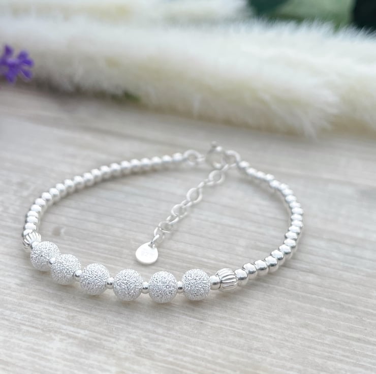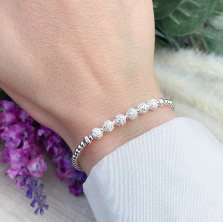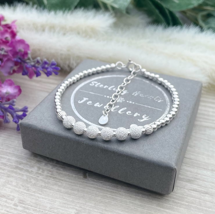 This 60th birthday bracelet is made with 3mm sterling silver beads, and 5mm sparkly sterling silver beads and is finished with an extended chain.