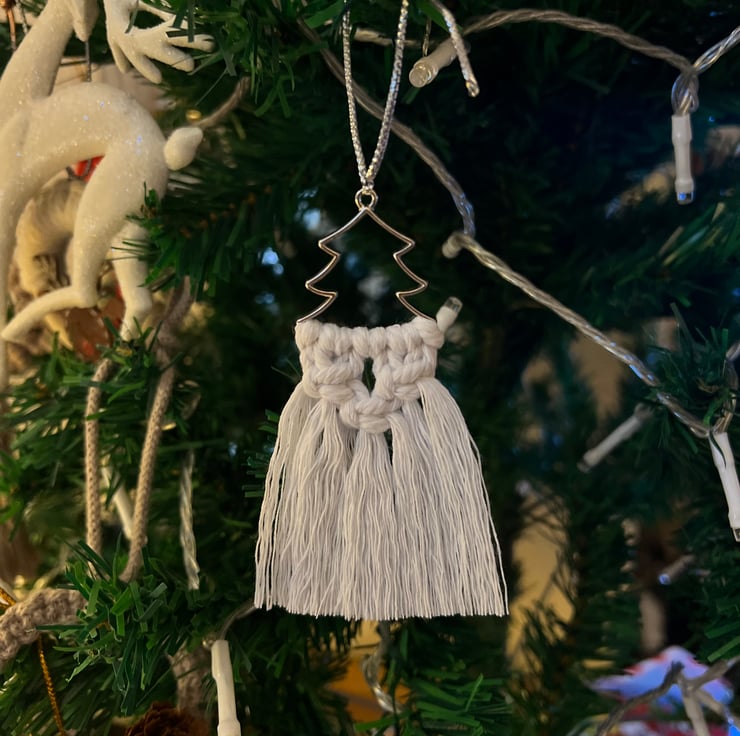 Decorate your tree with these boho macrame decorations in white accented with silver colour tree pendant.