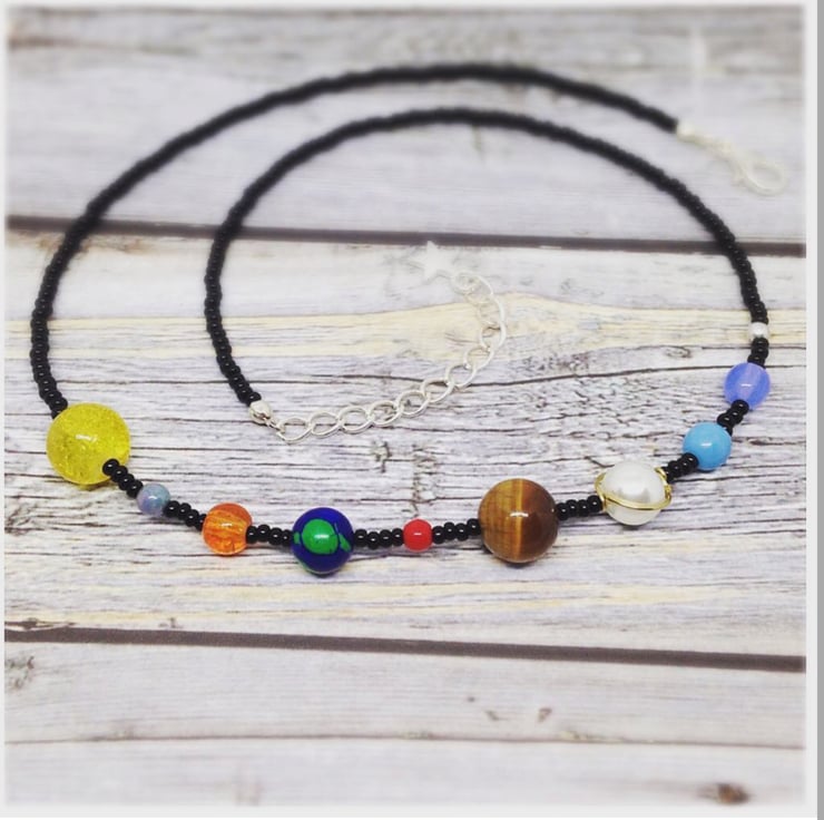 A beautiful and handmade beaded necklace featuring the magnificent Solar system from the Sun to the tiny dwarf star Pluto.