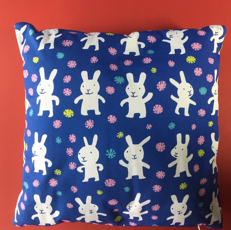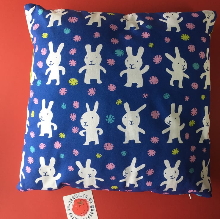 Made from fabric exclusive to me, my own Happy Bunnies textile print (see other listings for tea towels) Features lots of Bunnies standing around or doing tai chi. Front is printed 309gsm cotton. Back is plain green slightly lighter weight cotton. Zip, at bottom of cushion is pale blue.