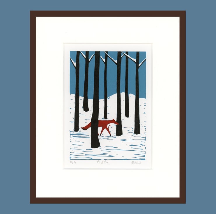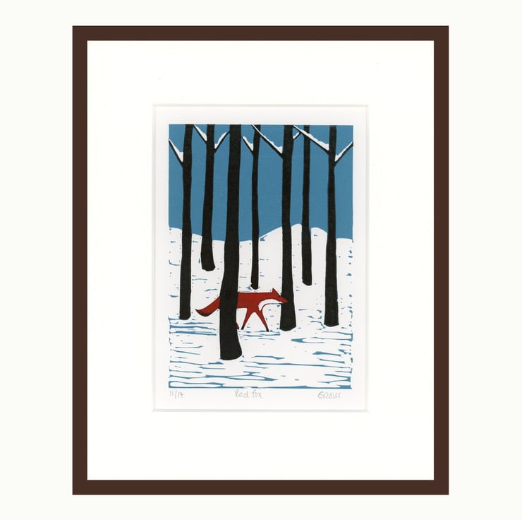 This is my four colour reduction lino print of Red Fox walking through a snowy forest at night.