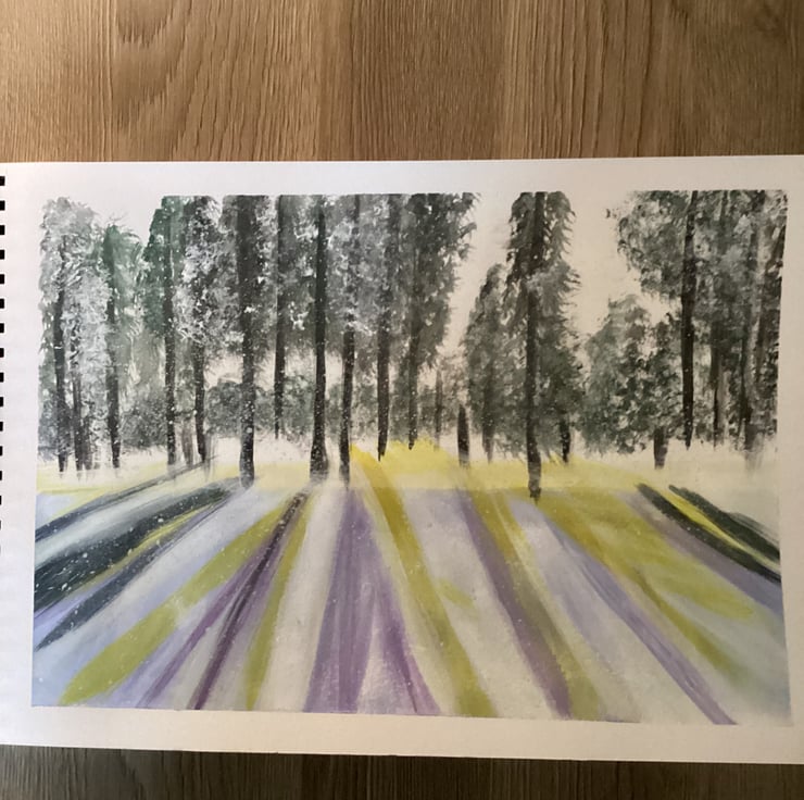 Wintry snowy, shadowcast watercolour, painting, 16.5 x 11.7 depicting, woodland, winter, snowy scene with the trees, casting shadows across the snow, colourful light capturing the magic and the serenity of snow and sun breaking light breaking through.