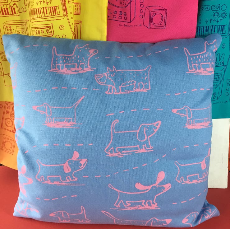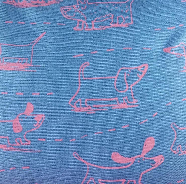 Happy Dogs hand screen printed design, pink ink on blue cotton. Featuring sausages dogs and dachshunds and some made up dogs!