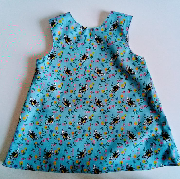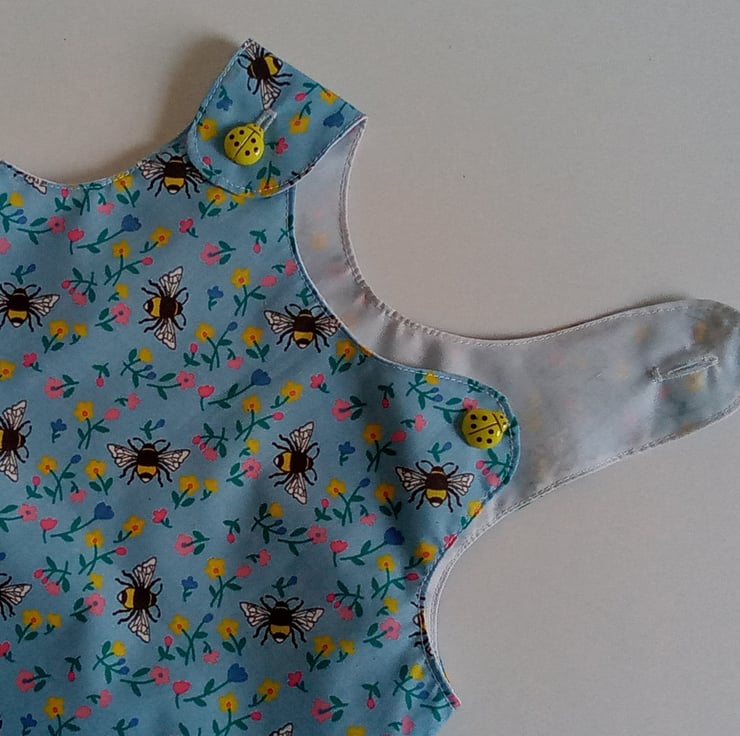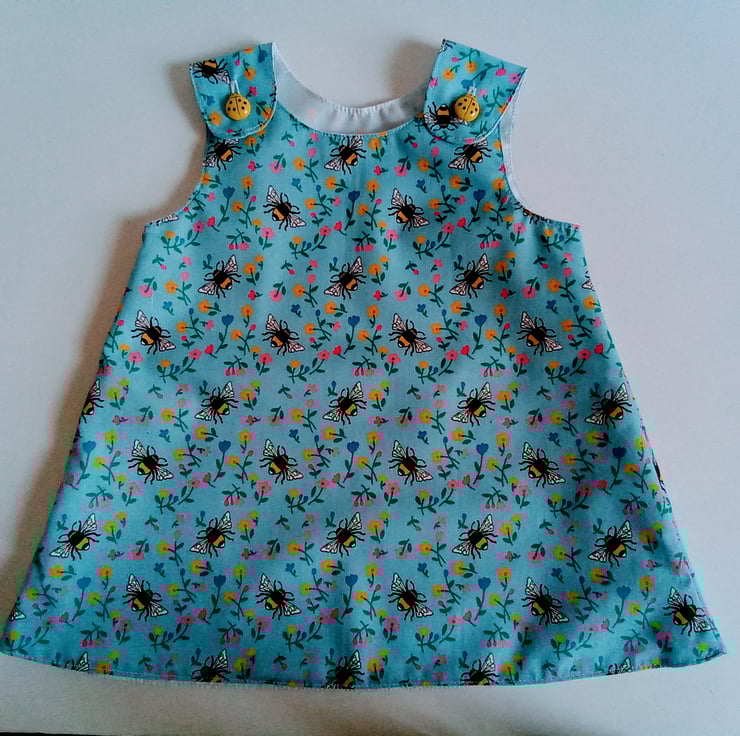 A line style dress in Blue with a lovely Bees and floral print featuring ladybird buttons.