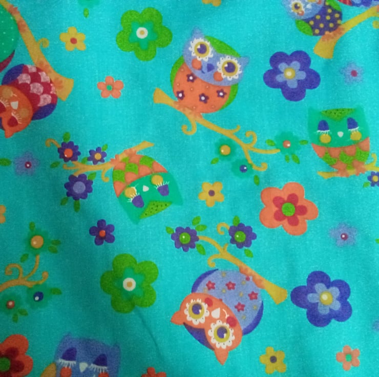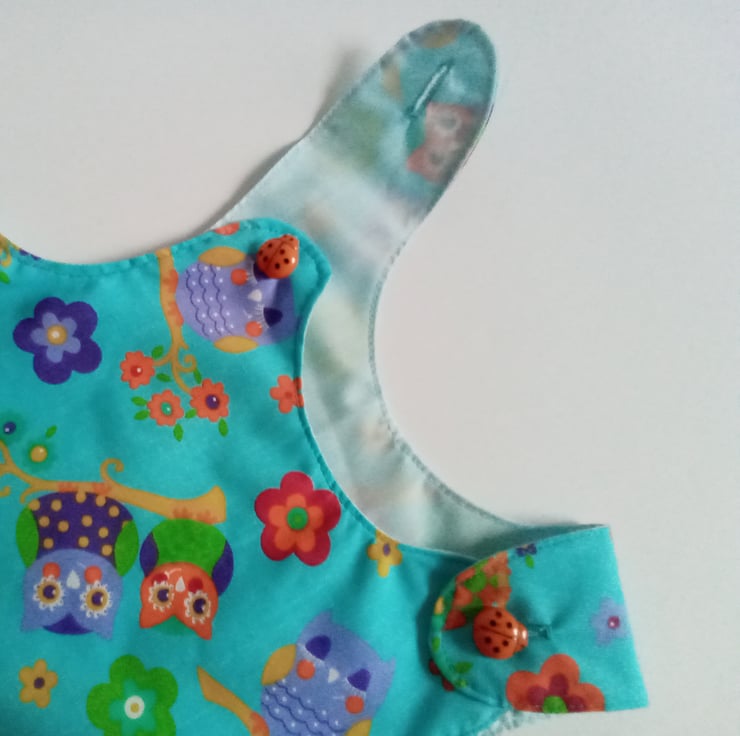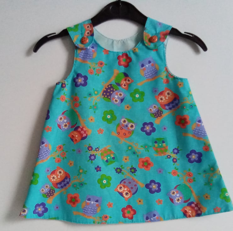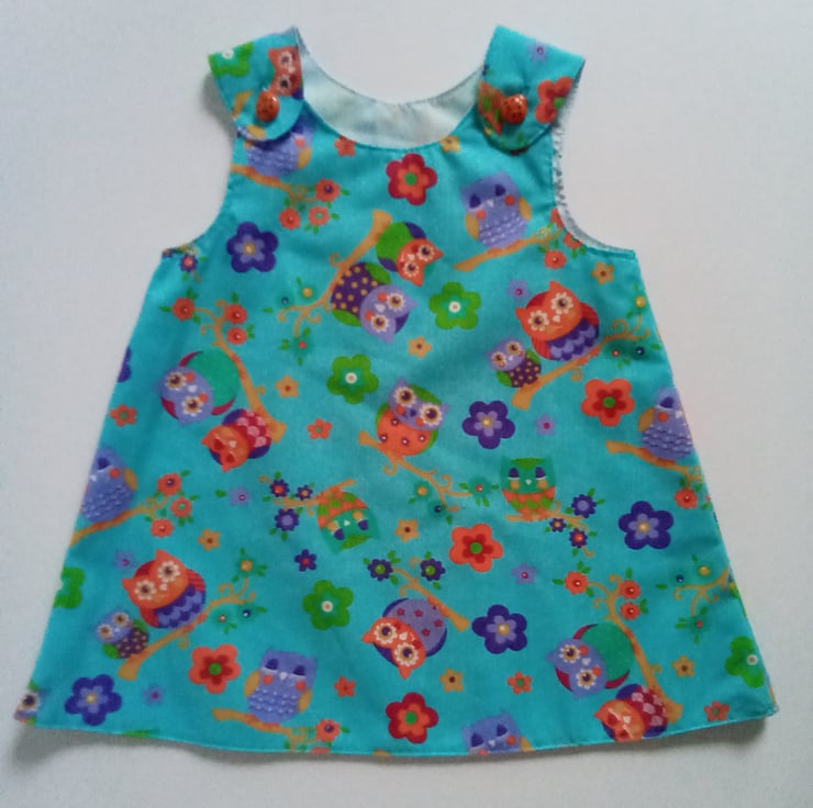 A Lined, A line style summer dress/pinafore in pale blue with an Owl and flowers design. It has ladybird shaped buttons.