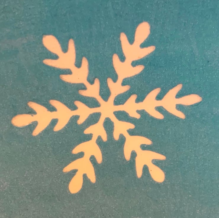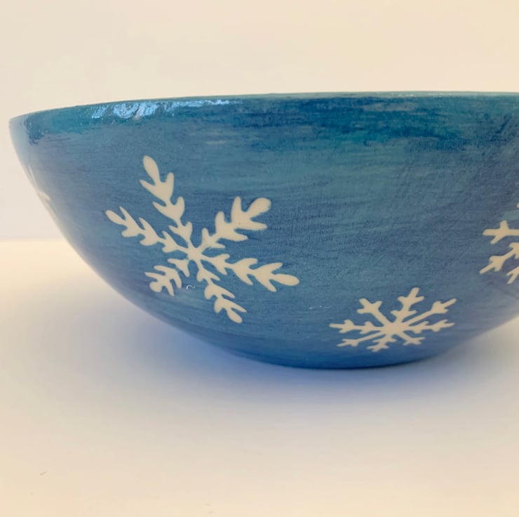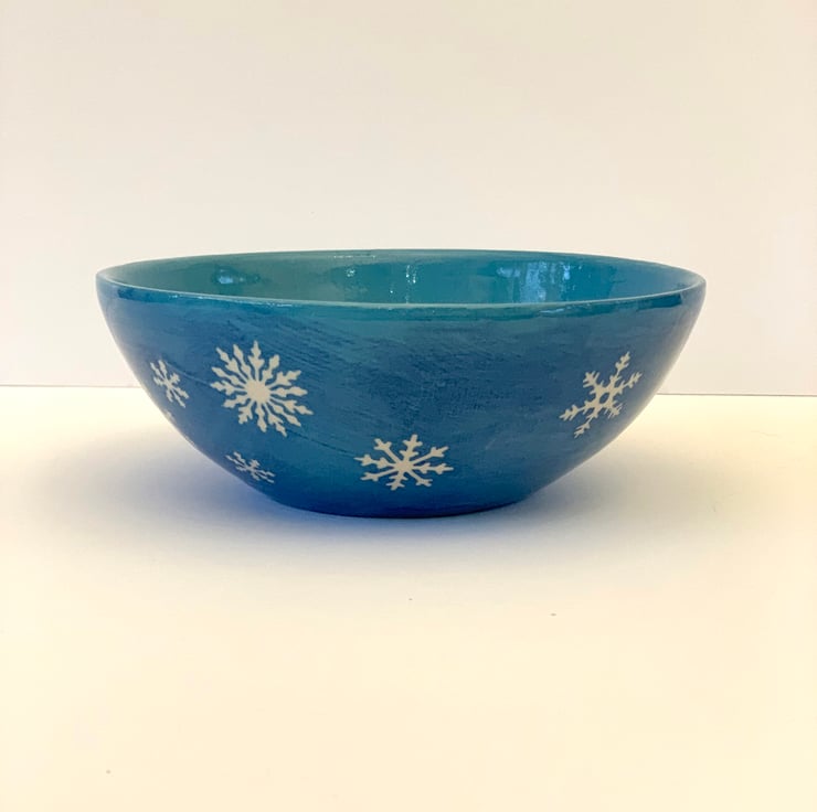 I love the different pattens the snowflakes make cascading across the bowl. I have enjoyed playing with a masking technique in order to make this graphic work.
