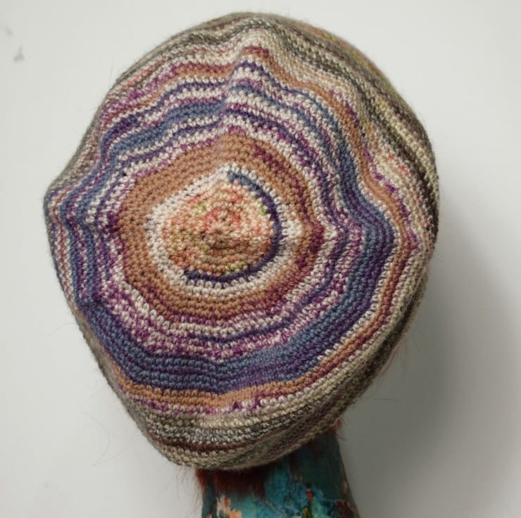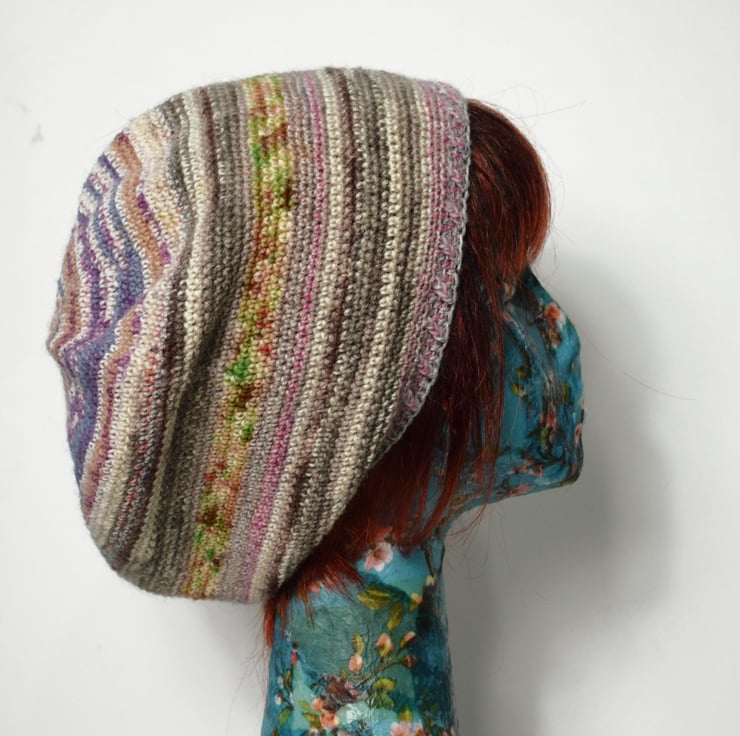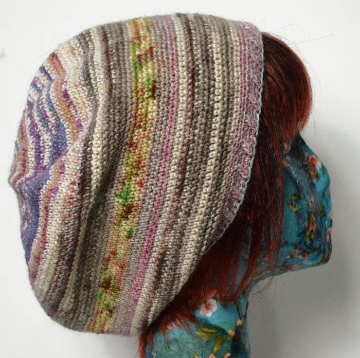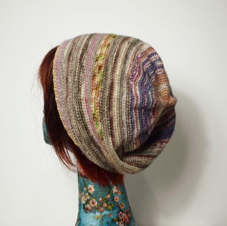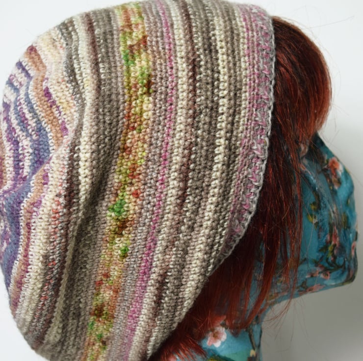 The colours are soft muted shades and run from purples and blues to pinks and soft browns. It has a slightly slouchy fit which is flattering to most face shapes and measures approx 9 inches from top to bottom and around 21 inches around the bottom but, as the band is ribbed, it will easily stretch out another couple of inches if needed.