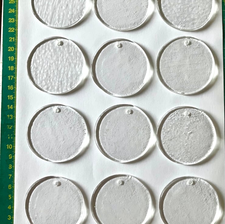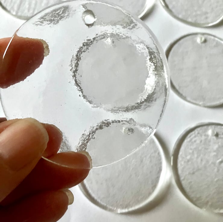 6cm clear circles with 3mm drilled holes. Handmade in the UK with Bullseye glass.