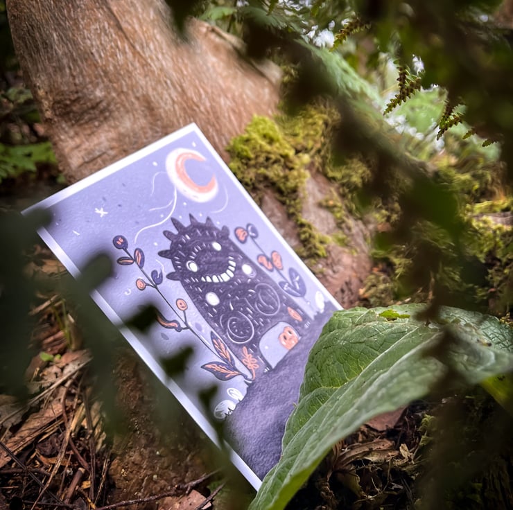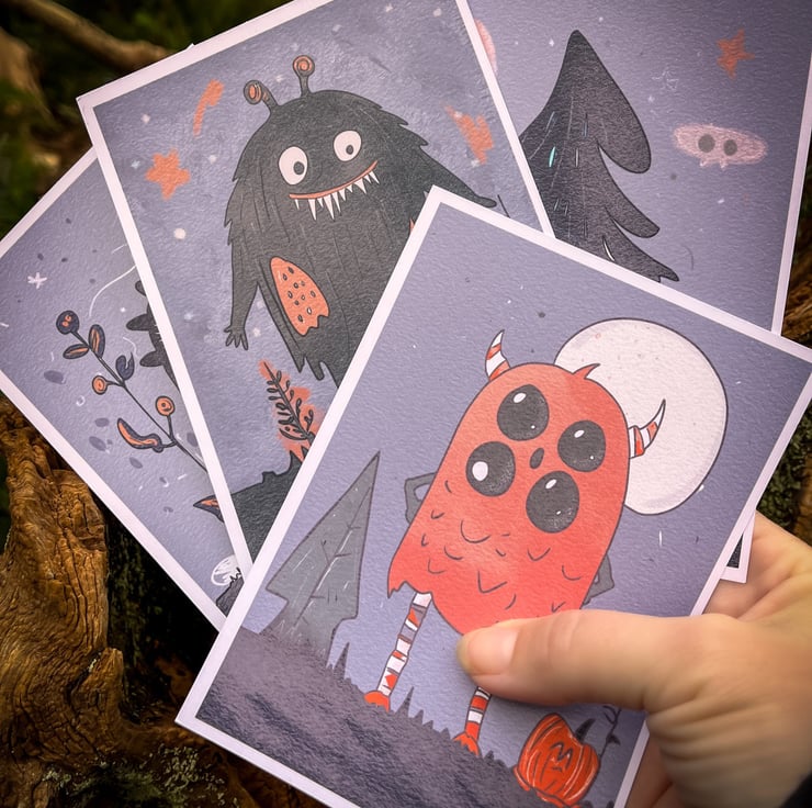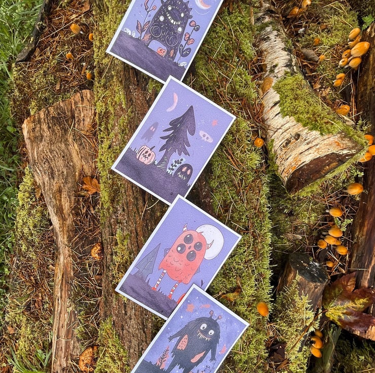 Set of four A6 postcards, each featuring a different Forest Monster , some even has a little Friend