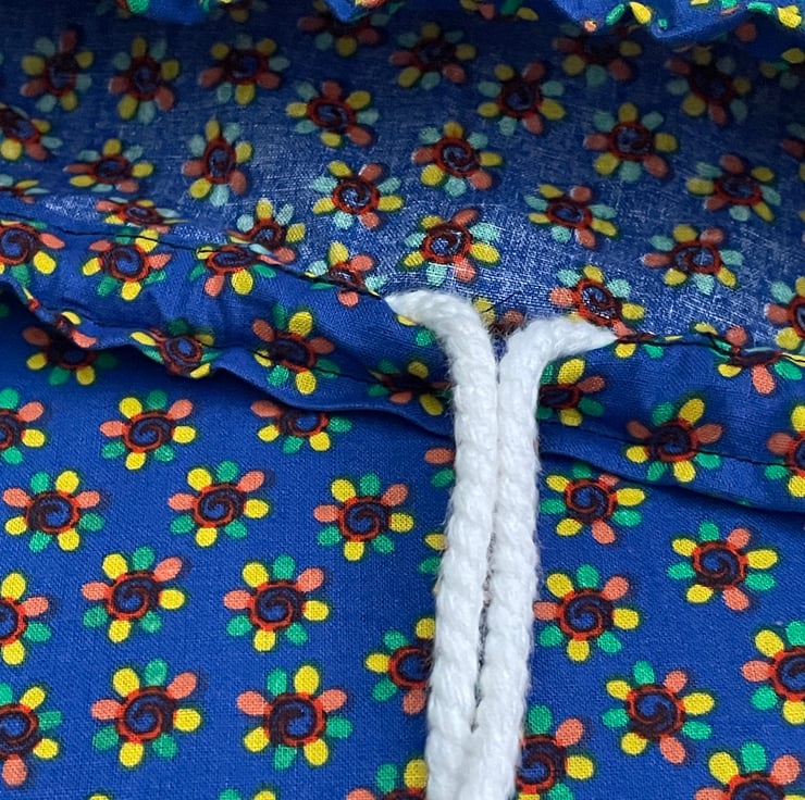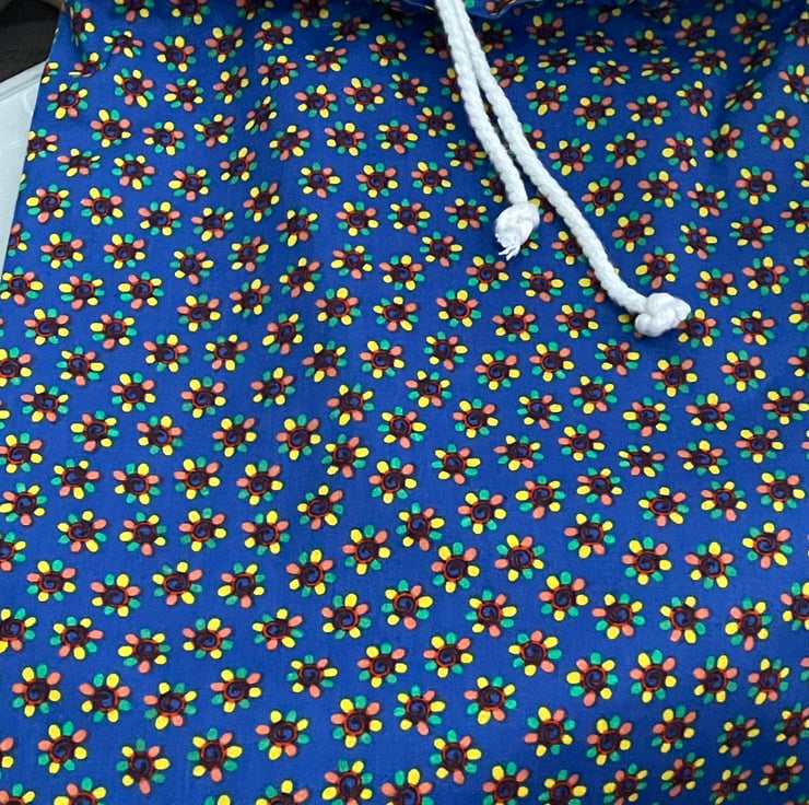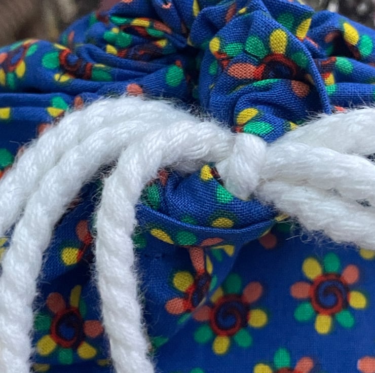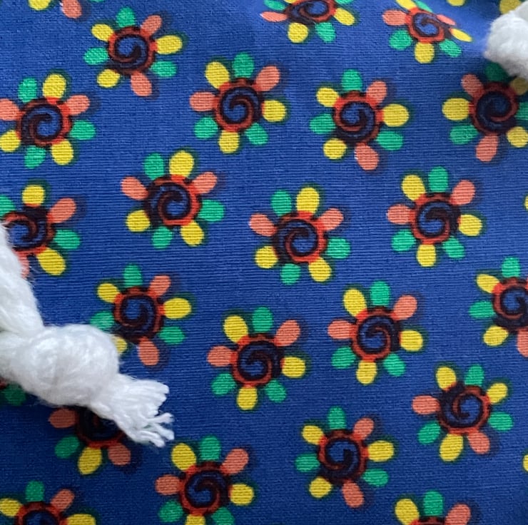 An environmentally friendly, reusable yet beautiful gift or storage bag. This 32x27cm (approximately) cloth bag is ideal for gift wrapping or storage. It is made from polyester cotton material, spare from a dressmaking project, and is strong and lightweight. The fabric is a lovely deep blue background with yellow, green and orange daisy flowers randomly printed all over it. It has neat and strong french seams so there are no raw edges. The top of the bag has a channel sewn into it and has a white rope effect tie. All materials have been repurposed or taken from what otherwise would have been waste. Totally reusable for many purposes.