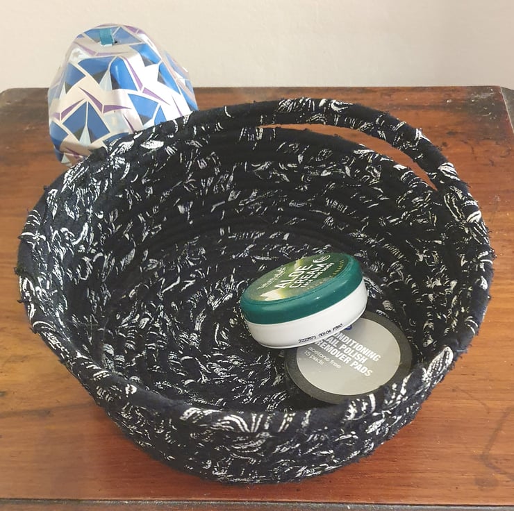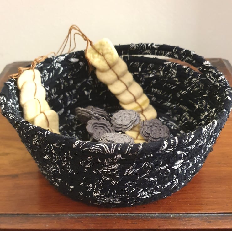 This basket is coiled fabric in black and white jersey material and is one of just a few with handles. Baskets are useful small storage in bedrooms or bathrooms for jewellery items or makeup. Baskets are equally suitable in a hallway for keys or in the kitchen for all the bits and pieces that collect (rubber bands and paperclips, for example!).