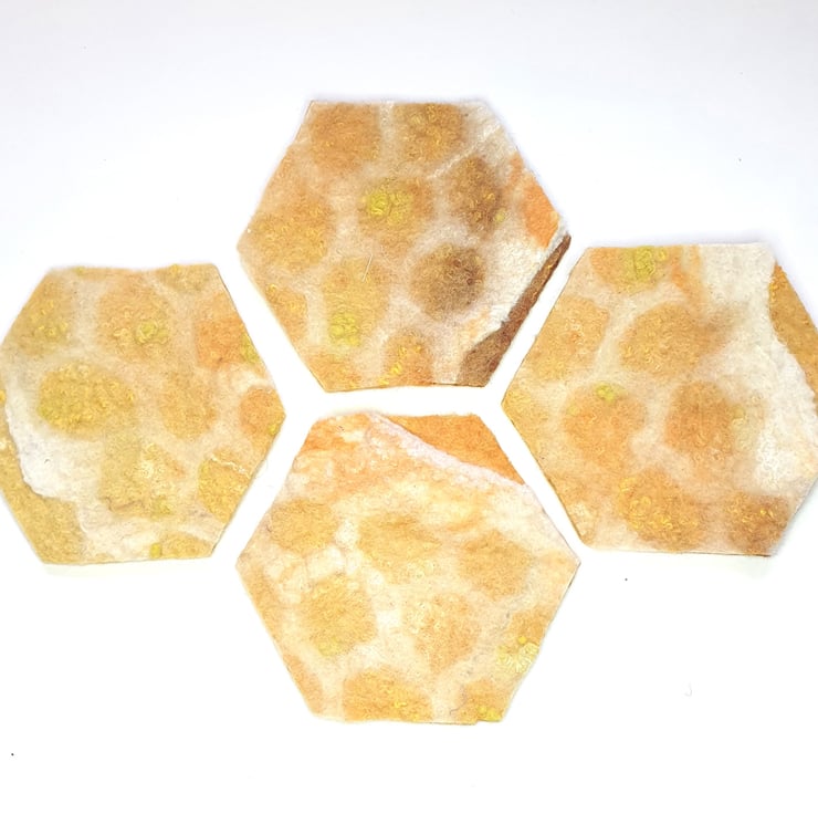 These textured coasters in handmade felt are unique as the making process was a fluke and I can't repeat it! They are hexagonal and also have a honeycomb design on them - each one is different. An ideal gift for a man or someone with a new home to decorate and really unusual. What about as a golden wedding anniversary gift? Light and easy to send - and won't get broken in transit!