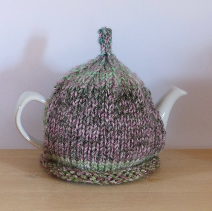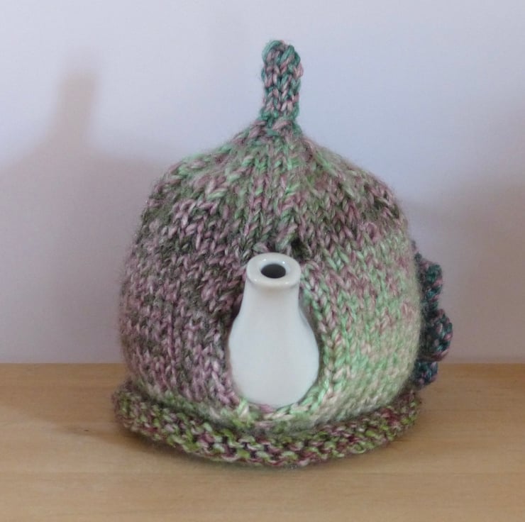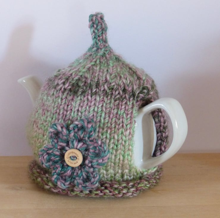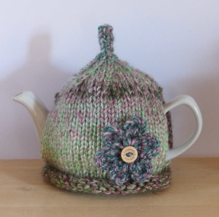A hand knitted Tea Cosy in a chunky variegated yarn in shades of Green, Pink and Purple. It has a 'pixie' top and a crocheted flower, in the same yarn as the cosy, on the front for decoration with a wooden button with the words 'Handmade With Love' in the centre.