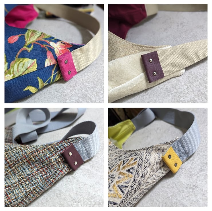 The strap is 38mm wide cotton webbing and has been finished with a co-ordinating riveted leather tab which compliments the fabrics of the bag. The strap is securely stitched onto the bag above the leather tabs.