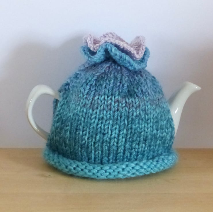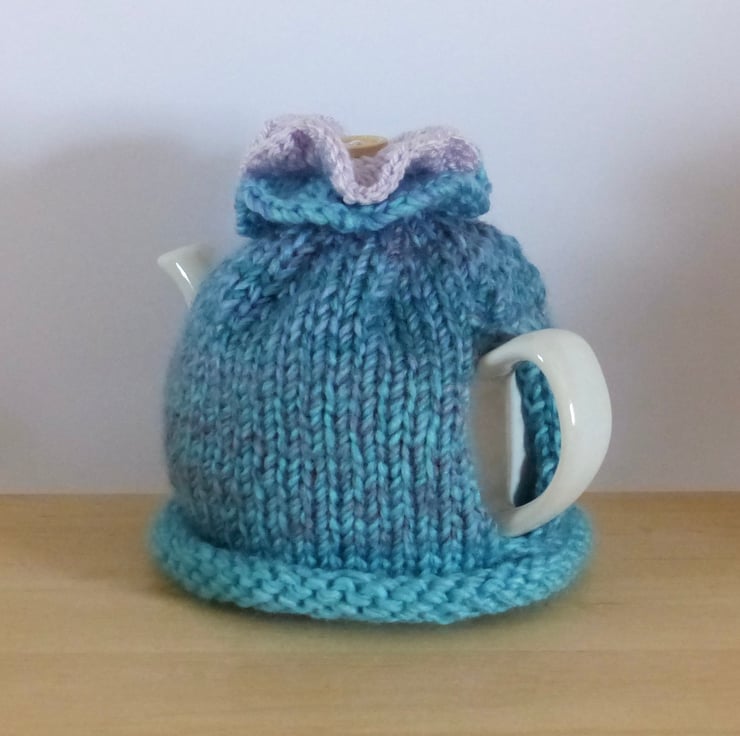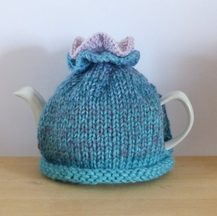 Knitted to fit a standard two cup teapot this cosy has a roll rim and plenty of stretch so should fit a variety of small pots.