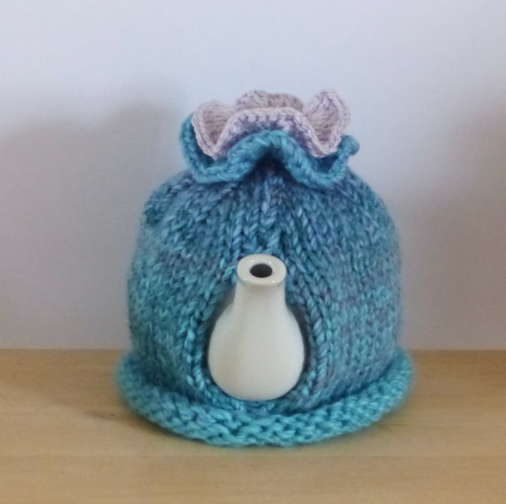 A hand knitted Tea Cosy in a chunky Turquoise variegated yarn topped with a large crocheted flower. The outer layer is in the same yarn as the cosy and the inner layer is Pale Lilac and it has a natural wood button in the centre.