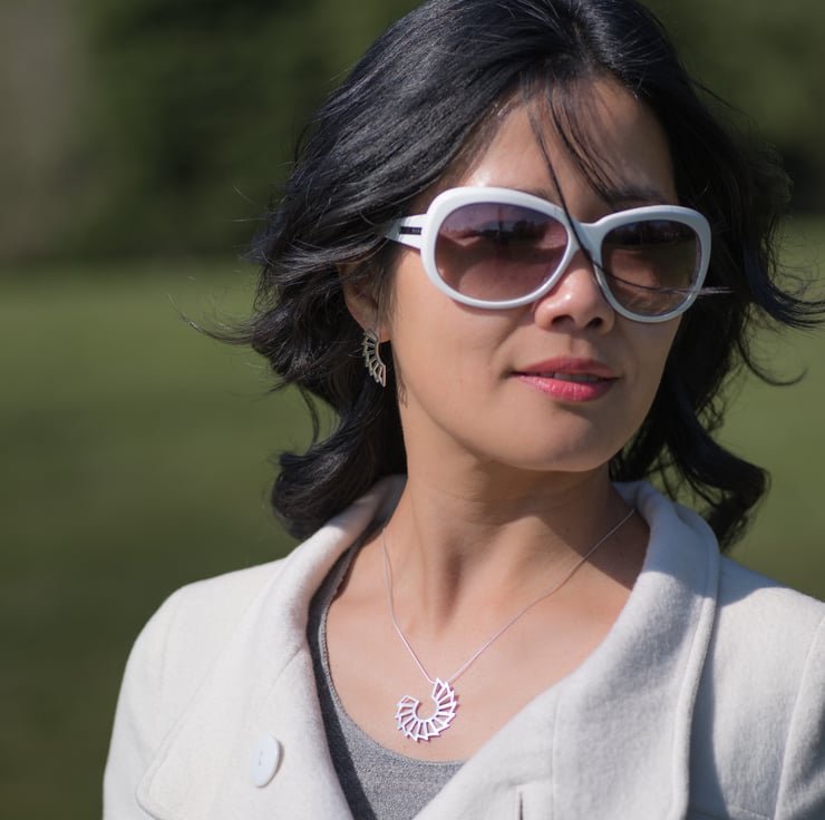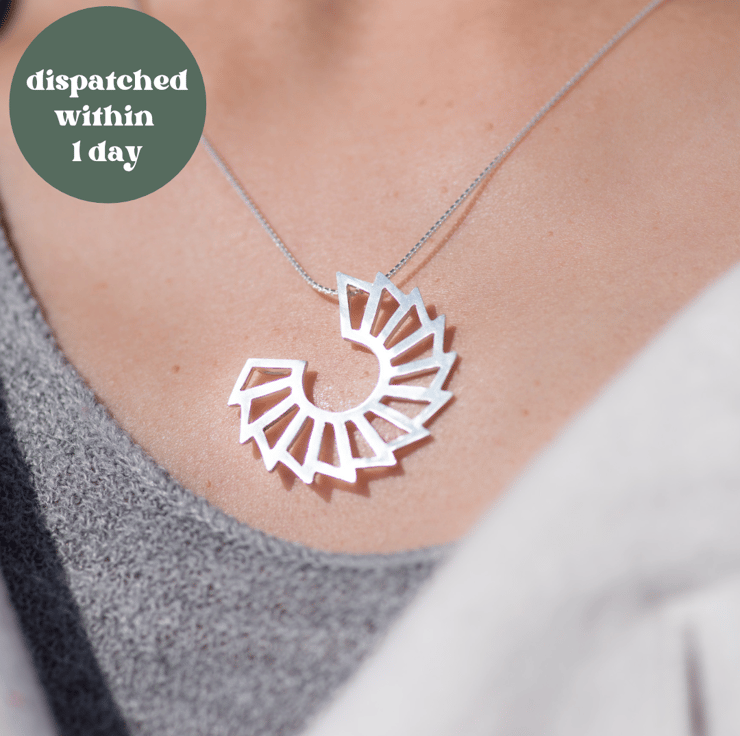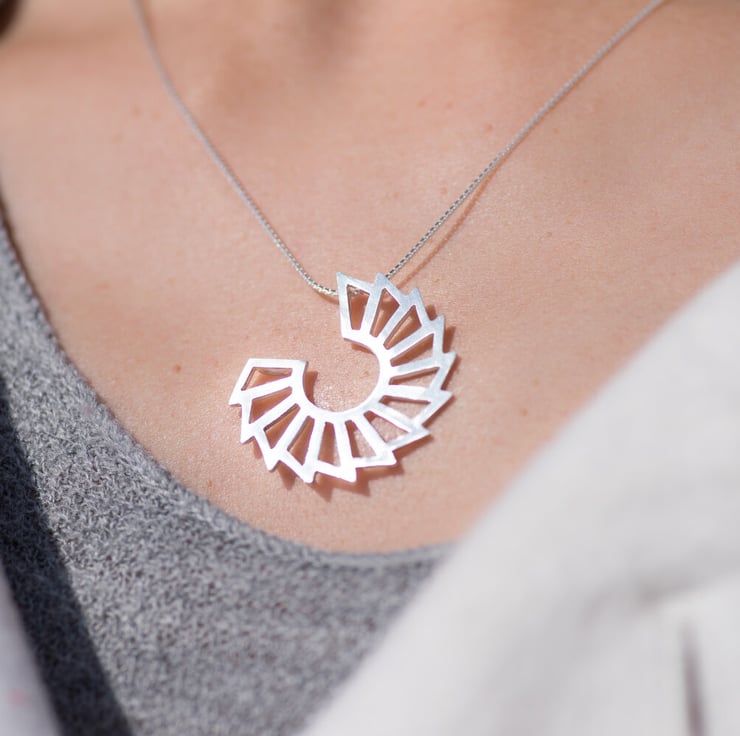 I created the simple geometric pattern of this polished, solid silver pendant necklace as a celebration of sun rays and freedom. It looks best worn on bare skin with a fine silver chain (supplied) and will gleam in the sunshine!