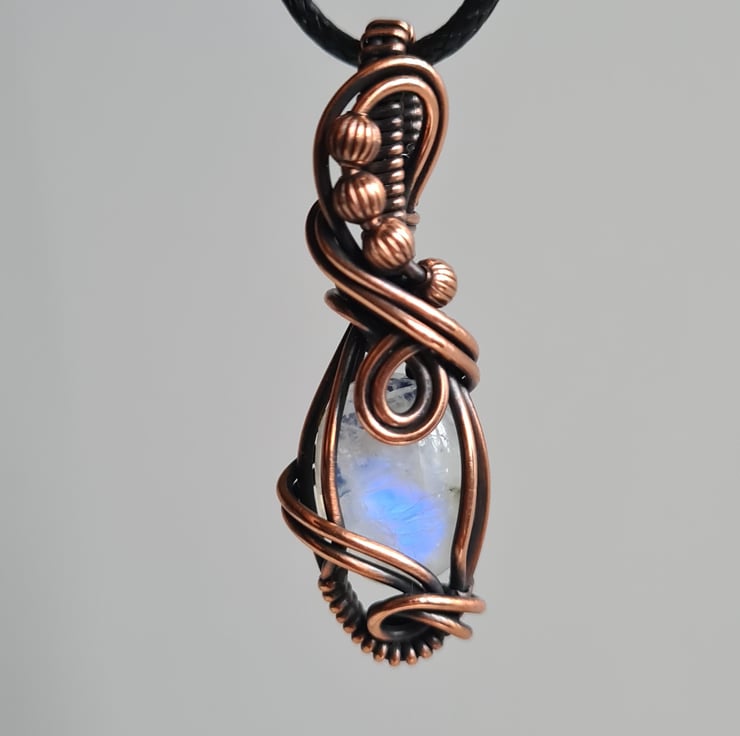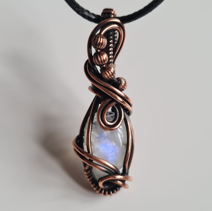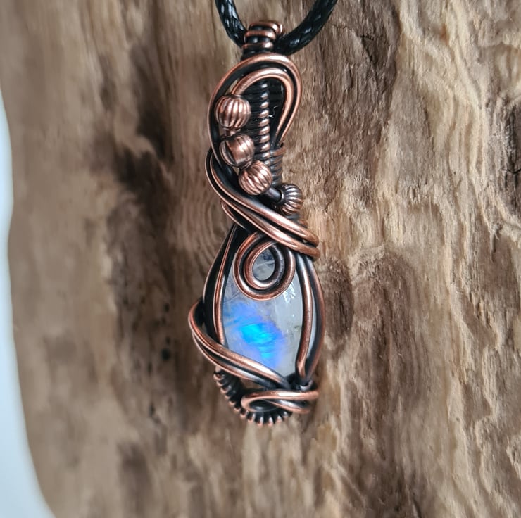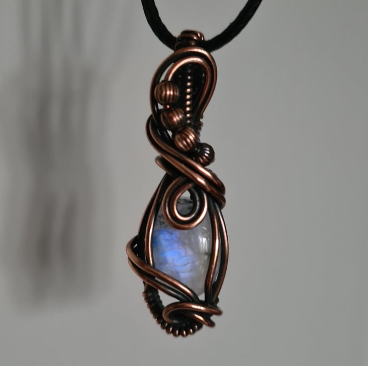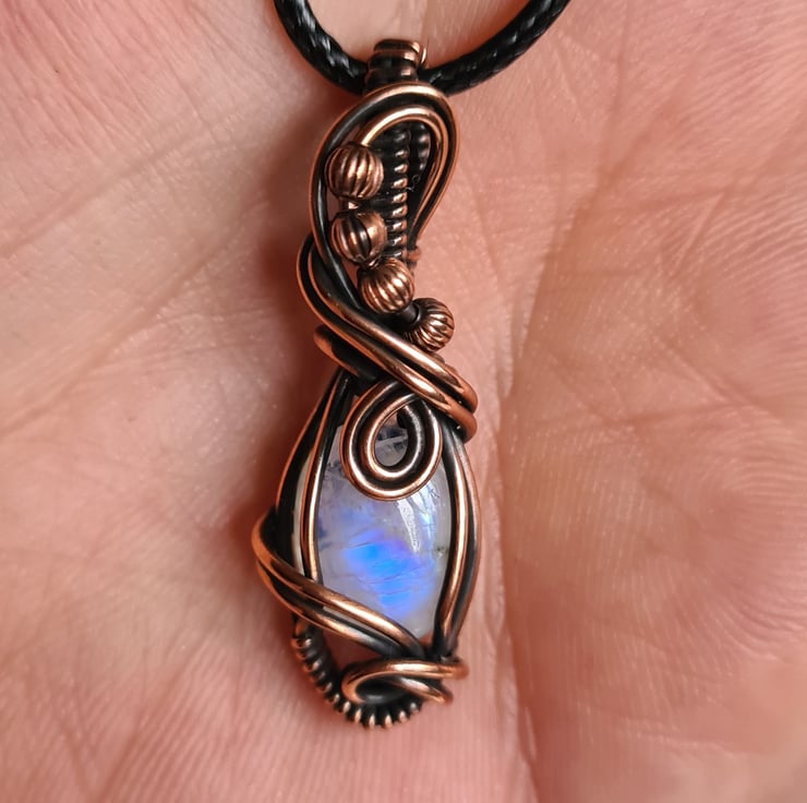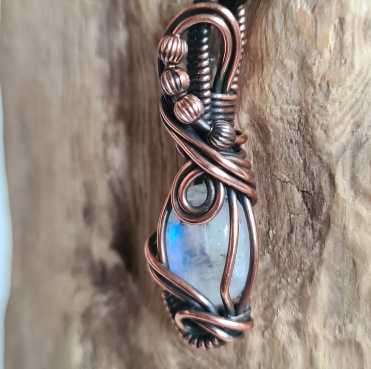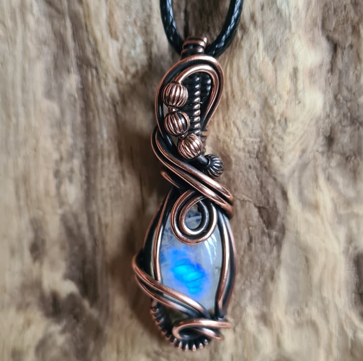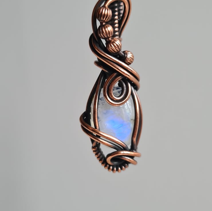 I have taken this lovely Natural Rainbow Moonstone and handwrapped it in antiqued copper into this elegant design. This moonstone has a beautiful bright blue flash to the stone and looks amazing teamed with the copper.