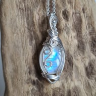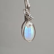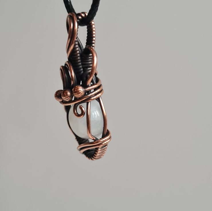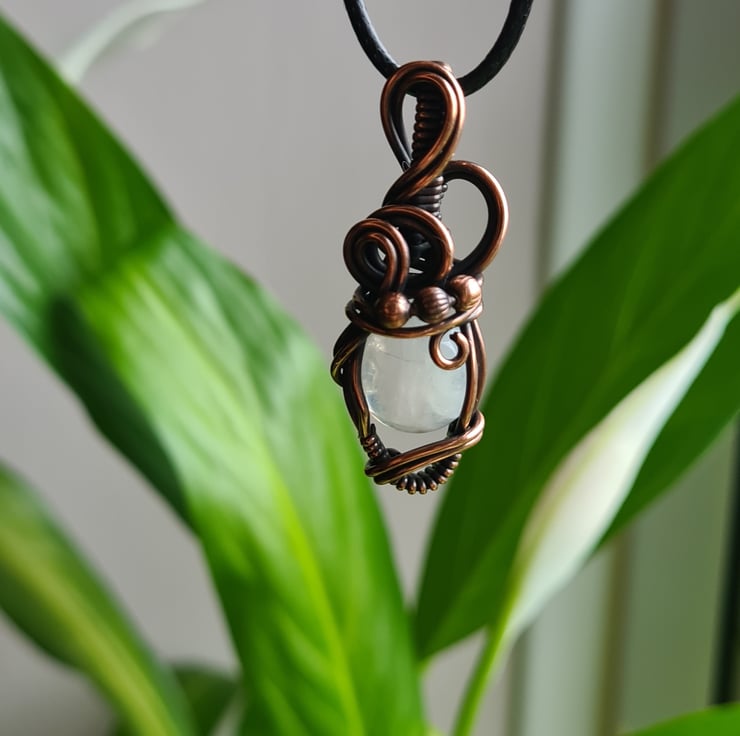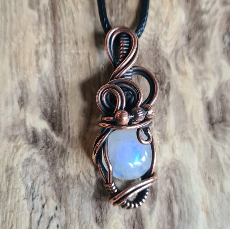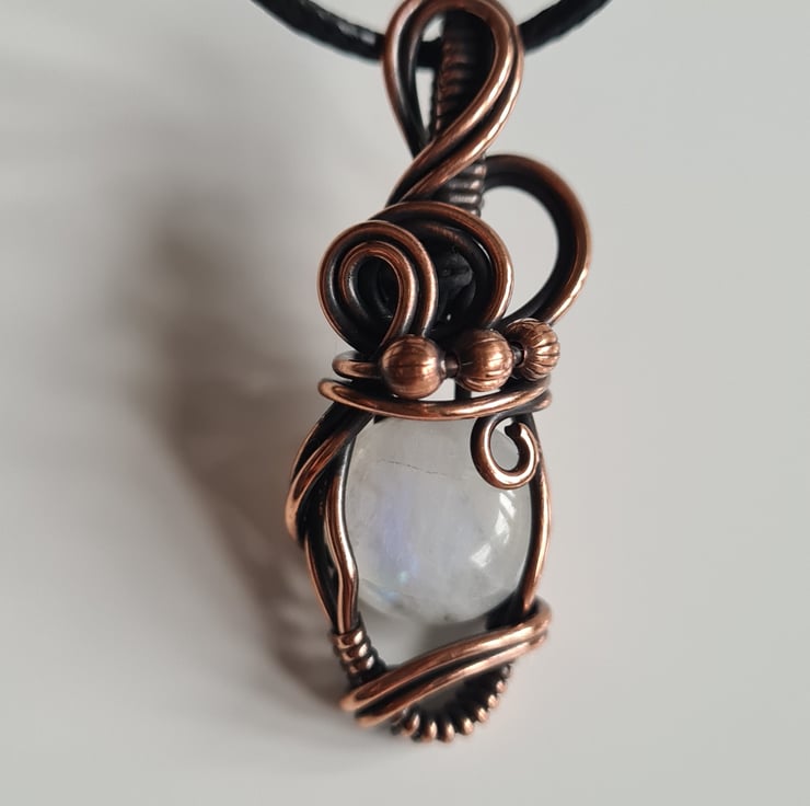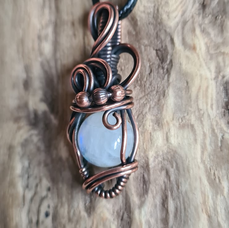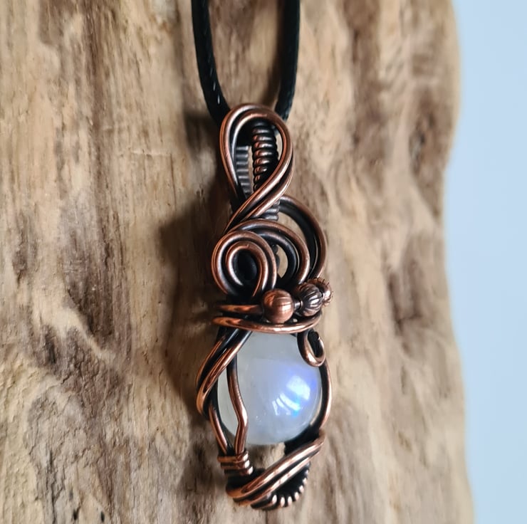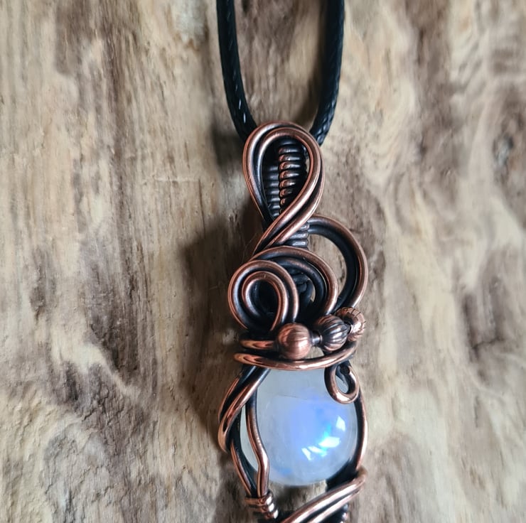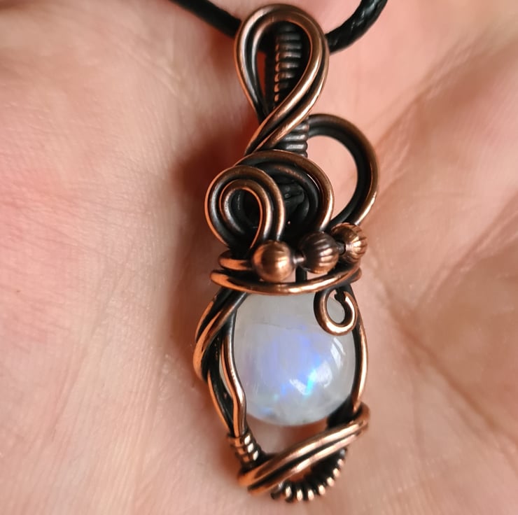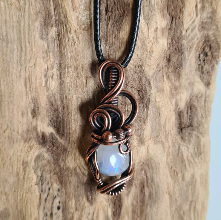 I have taken this lovely Natural Rainbow Moonstone and handwrapped it in antiqued copper into this elegant design. This moonstone has a lovely subtle rainbow flash to the stone and looks amazing teamed with the copper.