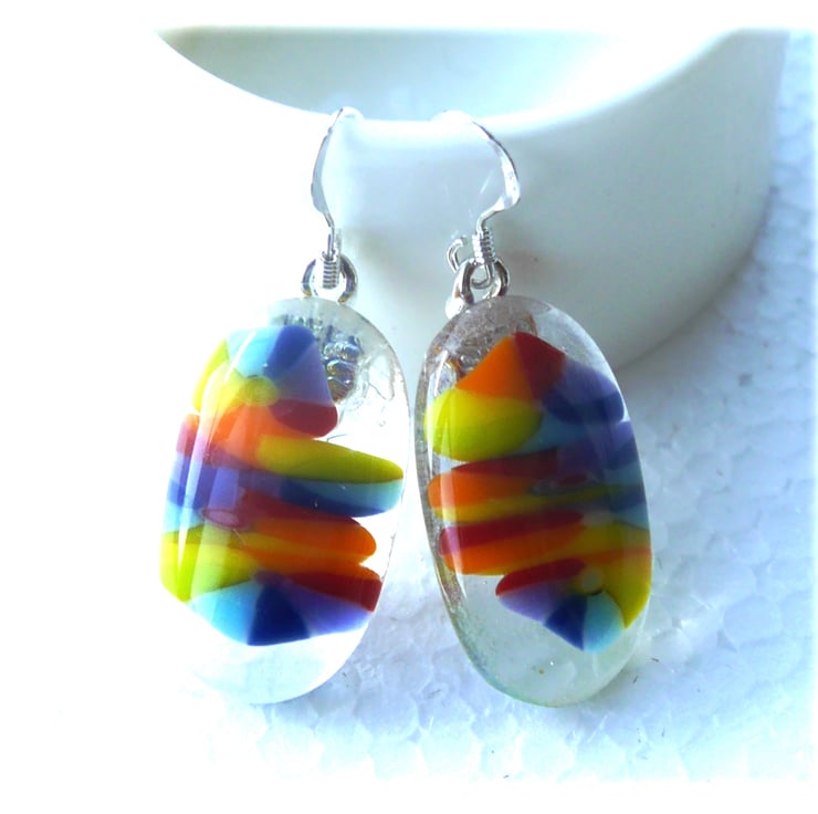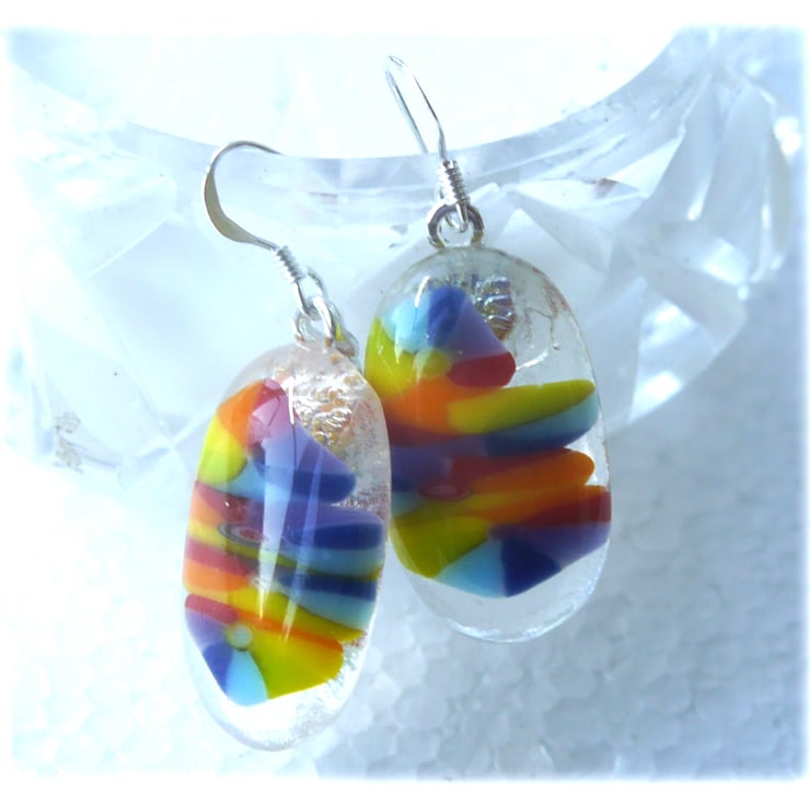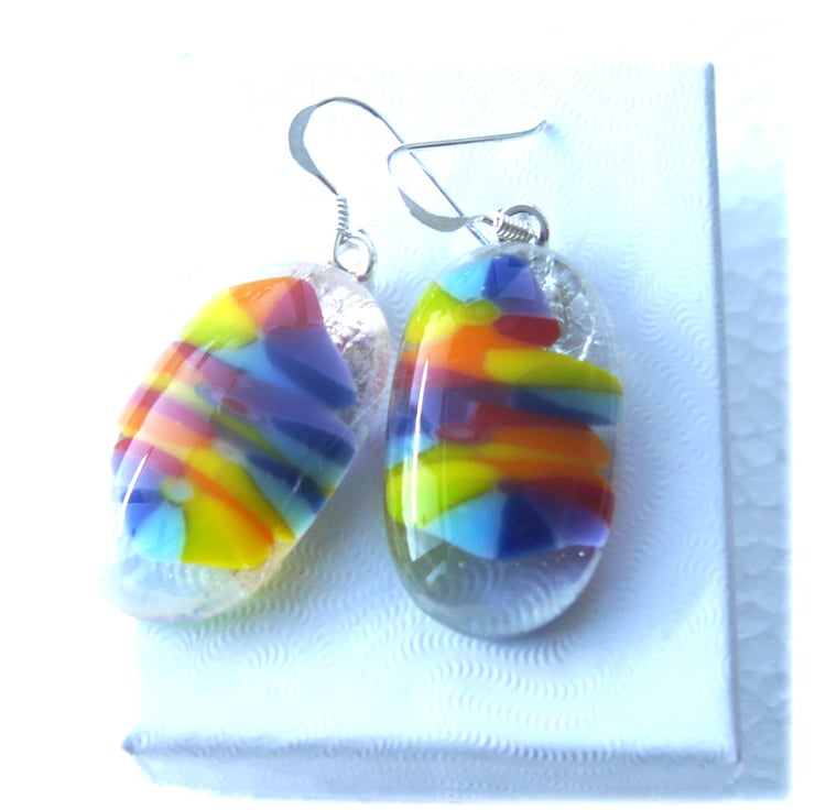 The earrings are hung from silver plated bails and then sterling silver hooks, the bails being securely glued in place to the back of the glass with the best glue available E6000..
