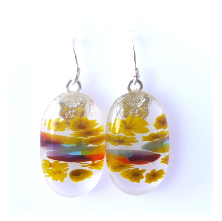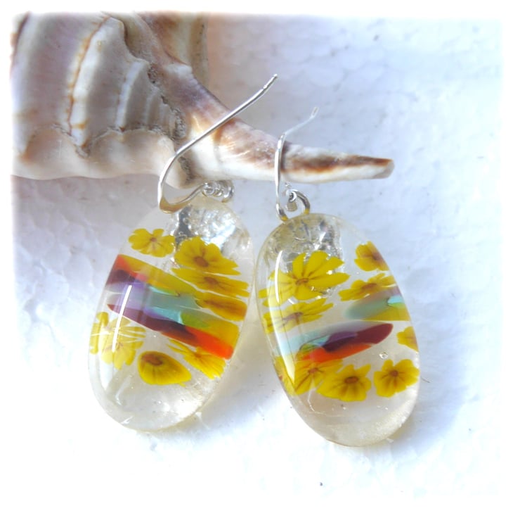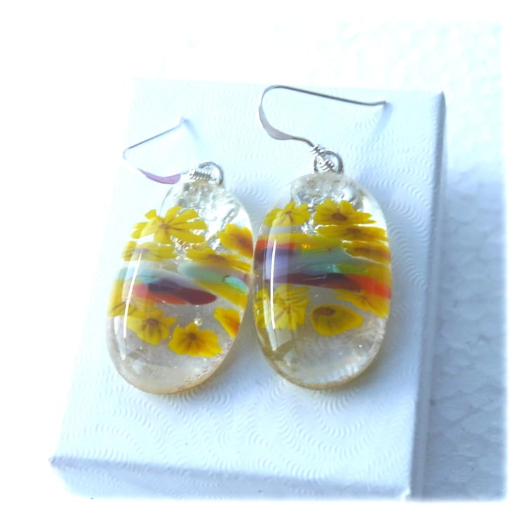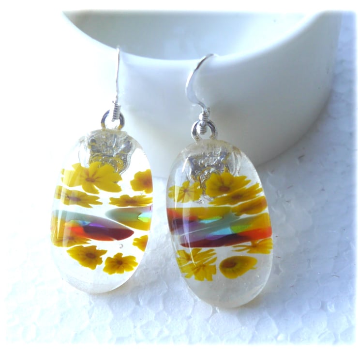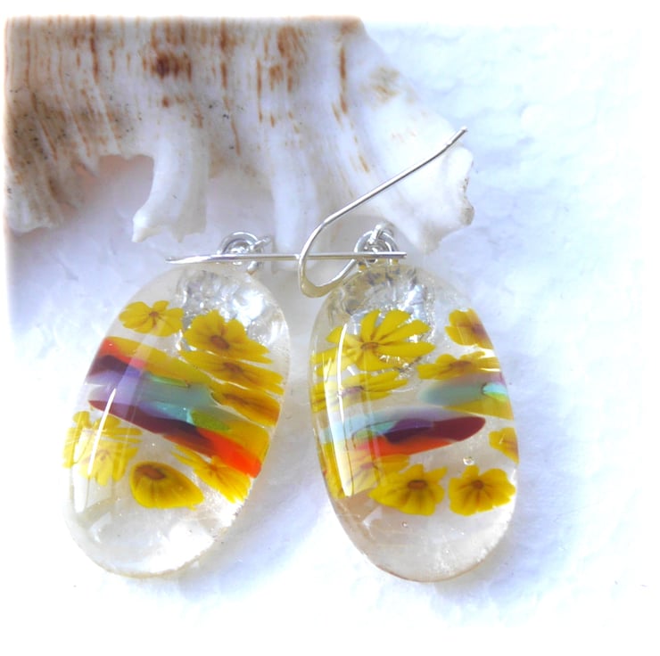 Earrings Fused Glass Millefioiri Handmade M011 Yellow Rainbow Flowers