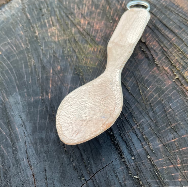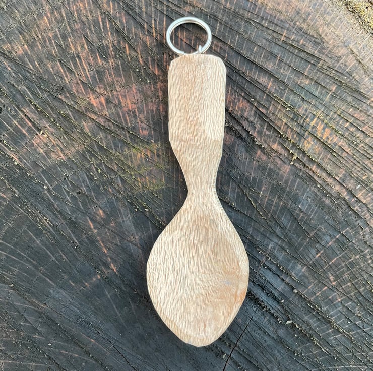 Hand carved 2” inch spoon. A handy, portable tool to use out and about when you are in need to scoop up some grub. Each spoon keyring is carved with a leaf motif. All spoons are finished with either flax oil or spoon butter (a concoction of natural beeswax and flax oil).