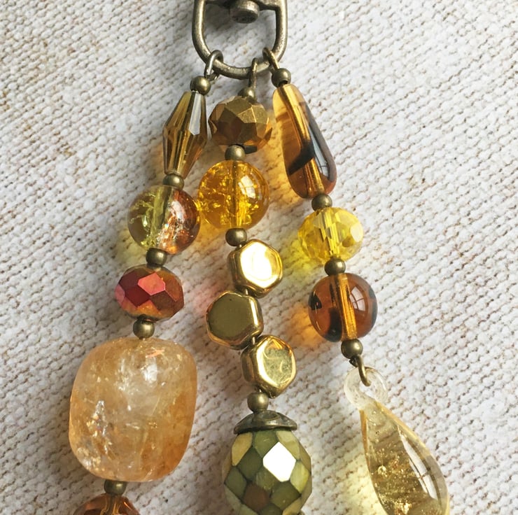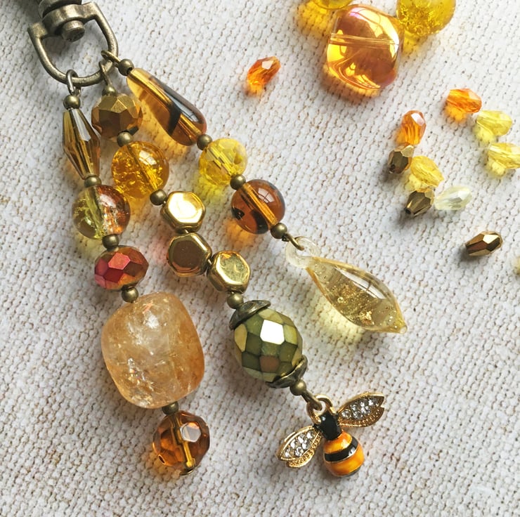 This pretty bag charm has a small metal bee, Citrine nugget and a selection of glass beads in amber and honey tones. I've also used three tiny gold-tone honeycomb spacer beads.
