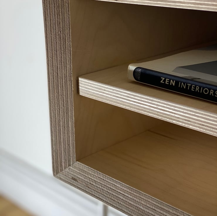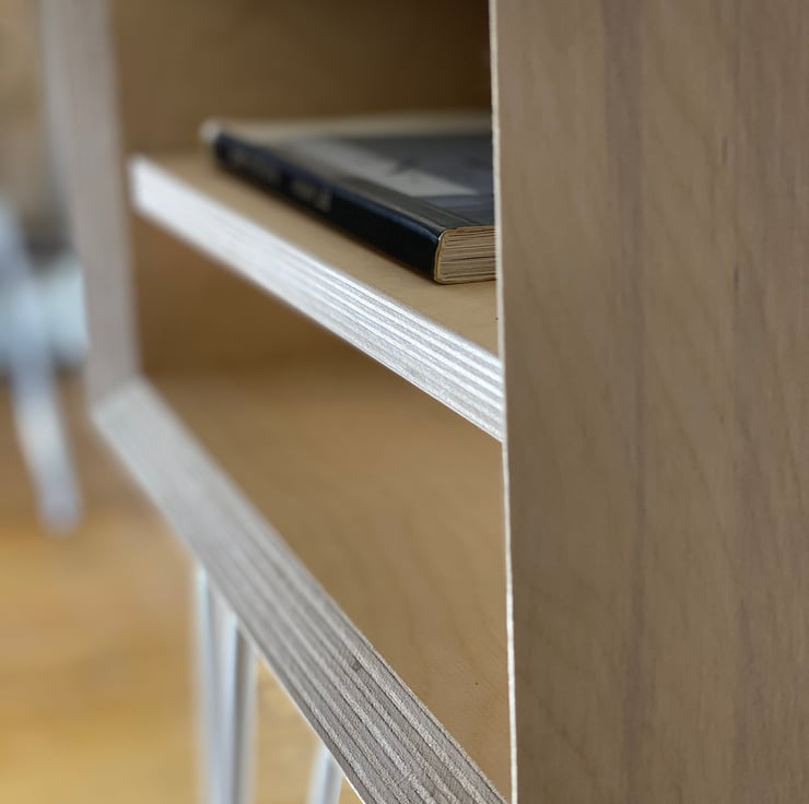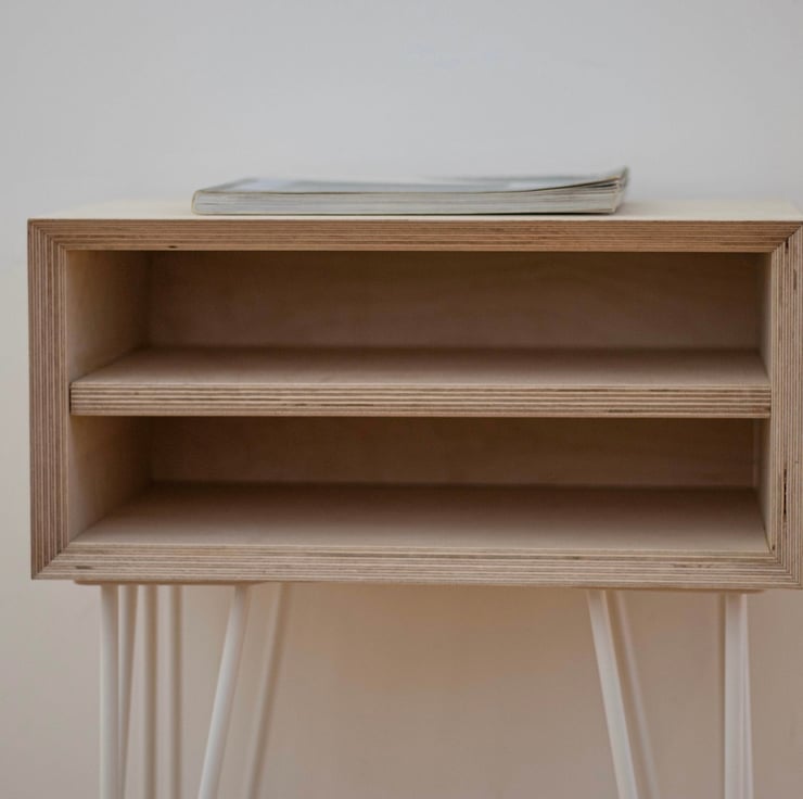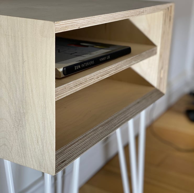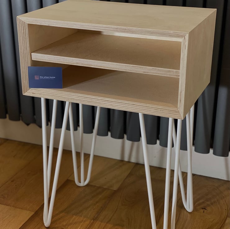 A cute and contemporary bedside table with one internal shelf. The table is hand made using good quality birch ply with mitred joints, which adds an interesting detail. This is a really useful little bedside table, offering two storage compartments and standing on four sturdy, steel hairpin legs.The birch ply is finished with high quality Osmo raw oil to keep it protected, while still retaining the pale natural look of the birch ply with its attractive, subtle grain.