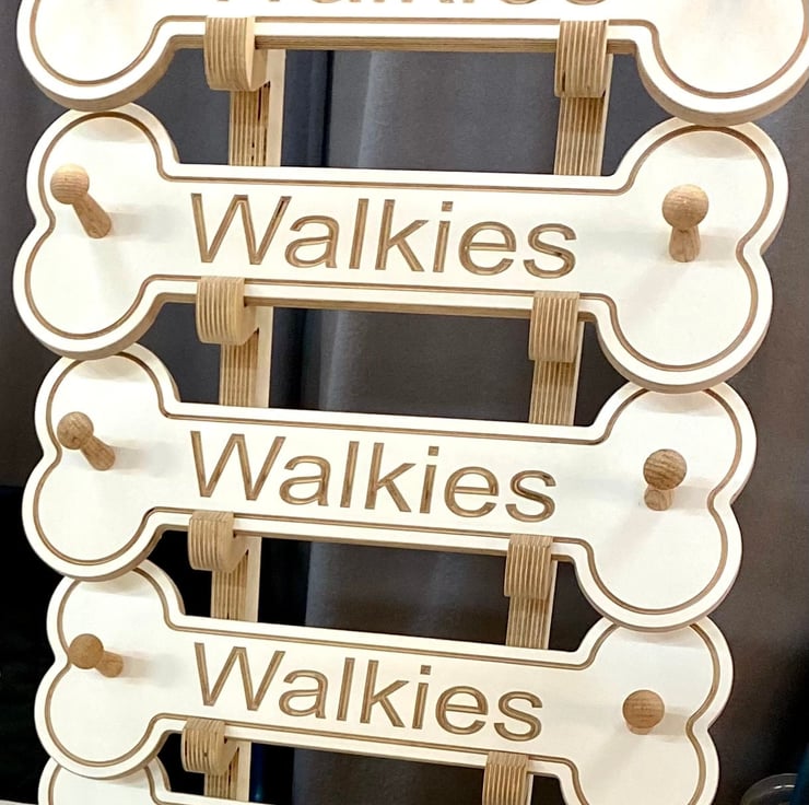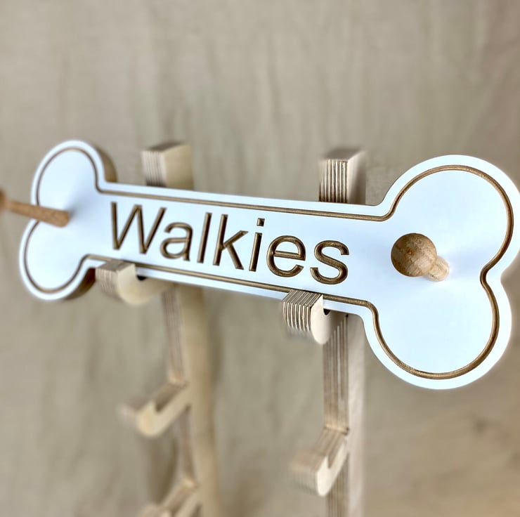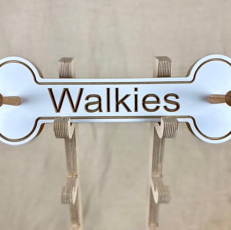 Made from white laminate birch ply with oak shaker pegs and Walkies engraved lettering.
